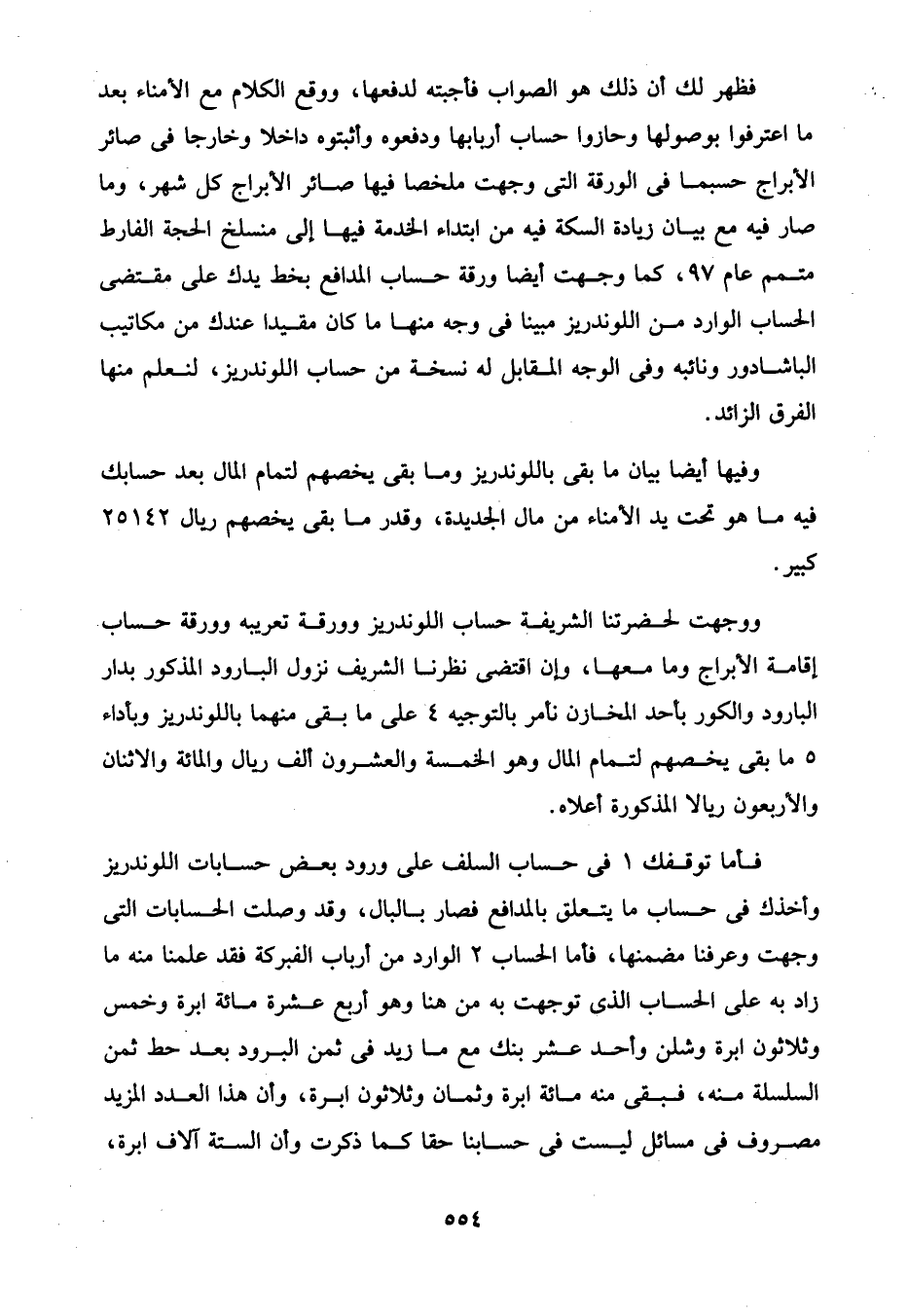 ووجهت لحضرتنا الشريفة حساب اللوندريز وورقة تعريبه وورقة حساب إقامة الأبراج وما معها، وإن اقتضى نظرنا الشريف نزول البارود المذكور بدار البارود والكور بأحد المخازن نأمر بالتوجيه 4 على ما بقى منهما باللوندريز وبأداء 5 ما بقى يخصهم لتمام المال وهو الخمسة والعشرون ألف ريال والمائة والاثنان والأربعون ريالا المذكورة أعلاه.