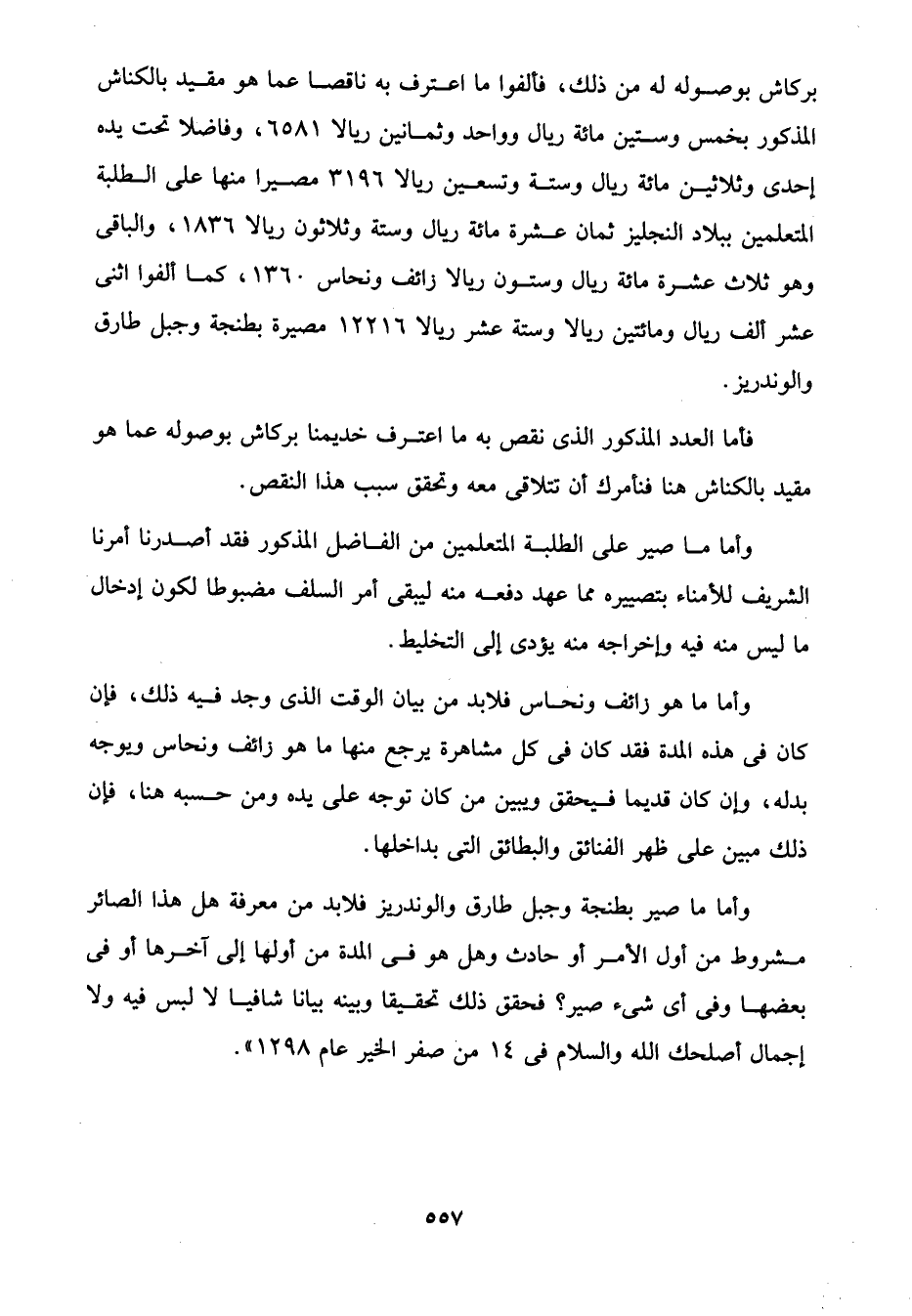 وأما ما صير بطنجة وجبل طارق والوندريز فلابد من معرفة هل هذا الصائر مشروط من أول الأمر أو حادث وهل هو في المدة من أولها إلى آخرها أو في بعضها وفى أى شئ صير؟ فحقق ذلك تحقيقا وبينه بيانا شافيا لا لبس فيه ولا إجمال أصلحك الله والسلام في 14 من صفر الخير عام 1298".