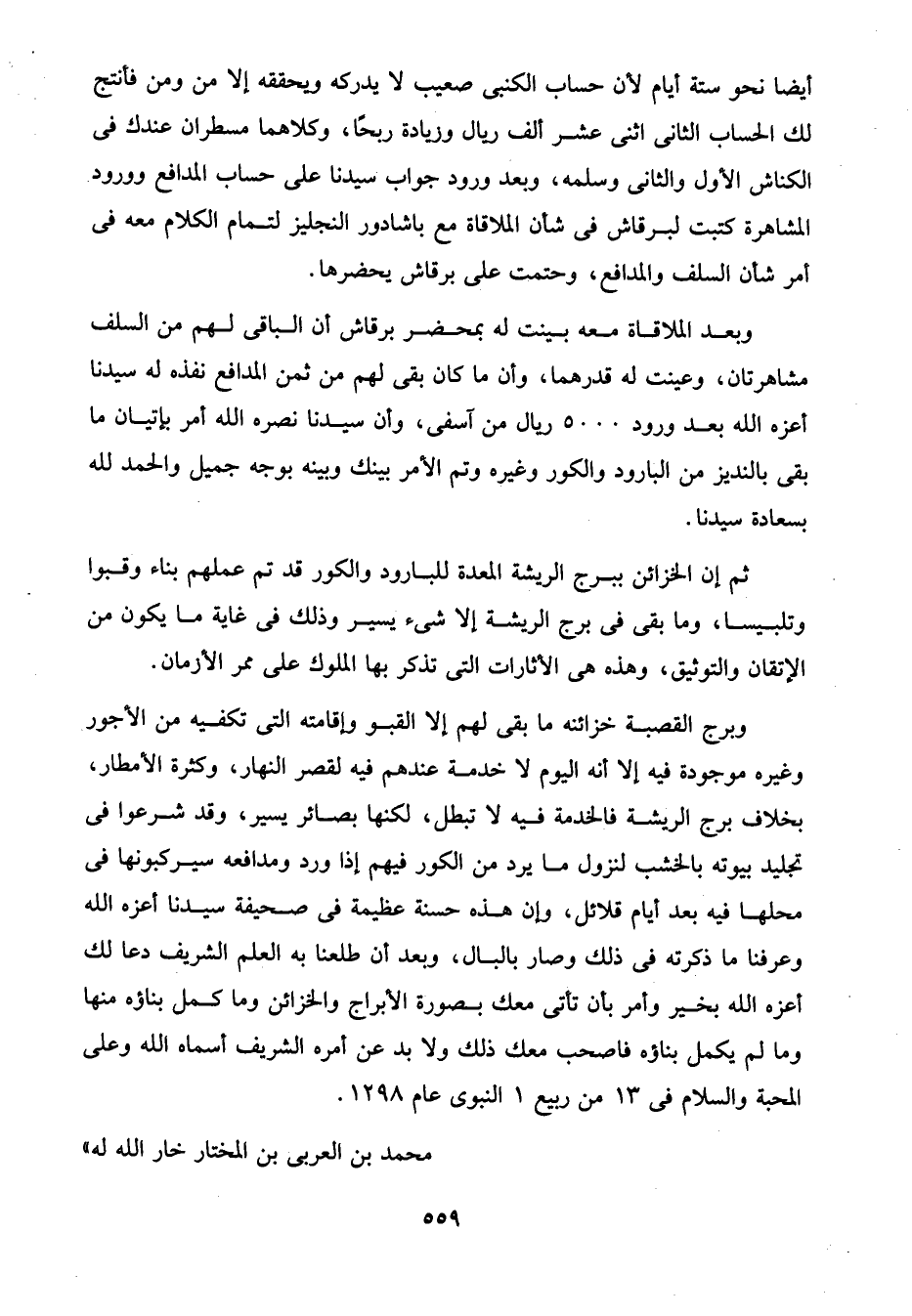 وبرج القصبة خزائنه ما بقى لهم إلا القبو وإقامته التي تكفيه من الأجور وغيره موجودة فيه إلا أنه اليوم لا خدمة عندهم فيه لقصر النهار، وكثرة الأمطار، بخلاف برج الريشة فالخدمة فيه لا تبطل، لكنها بصائر يسير، وقد شرعوا في تجليد بيوته بالخشب لنزول ما يرد من الكور فيهم إذا ورد ومدافعه سيركبونها في محلها فيه بعد أيام قلائل، وإن هذه حسنة عظيمة في صحيفة سيدنا أعزه الله وعرفنا ما ذكرته في ذلك وصار بالبال، وبعد أن طلعنا به العلم الشريف دعا لك أعزه الله بخير وأمر بأن تأتى معك بصورة الأبراج والخزائن وما كمل بناؤه منها وما لم يكمل بناؤه فاصحب معك ذلك ولا بد عن أمره الشريف أسماه الله وعلى المحبة والسلام في 13 من ربيع 1 النبوى عام 1298.