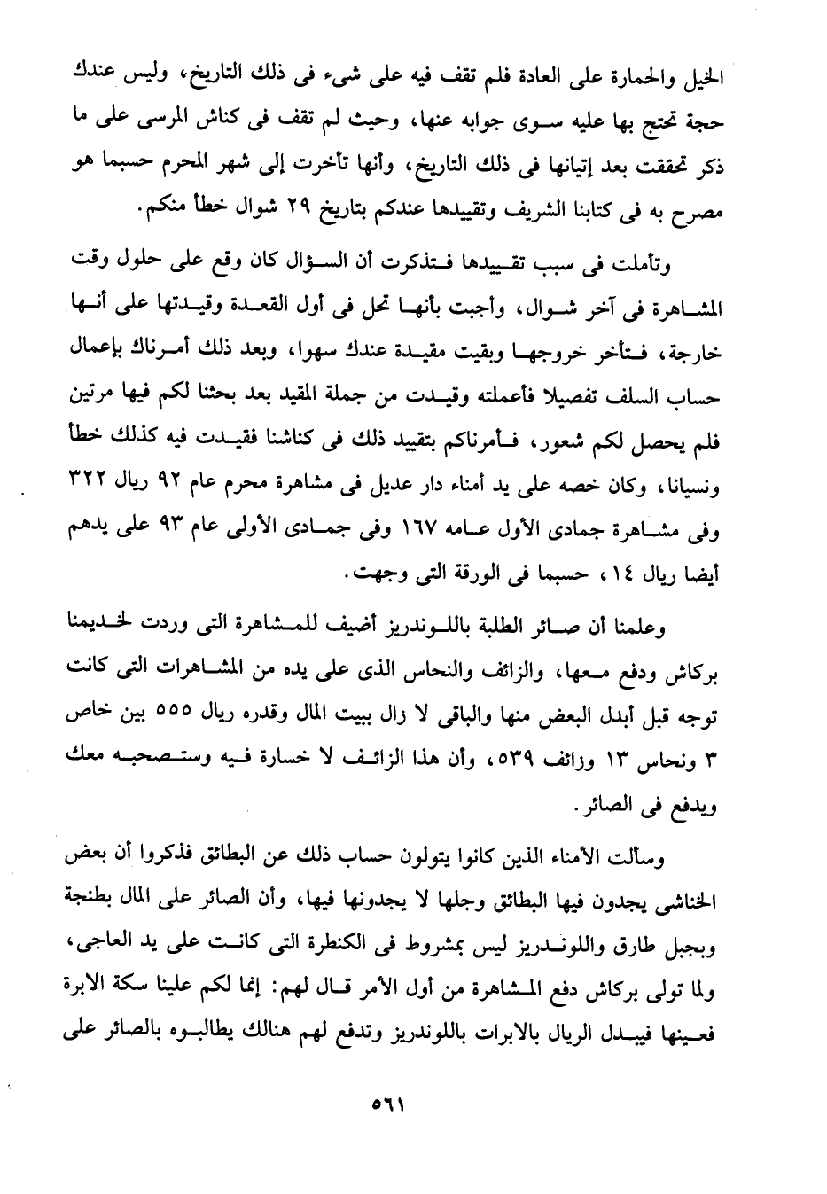 وتأملت في سبب تقييدها فتذكرت أن السؤال كان وقع على حلول وقت المشاهرة في آخر شوال، وأجبت بأنها تحل في أول القعدة وقيدتها على أنها خارجة، فتأخر خروجها وبقيت مقيدة عندك سهوا، وبعد ذلك أمرناك بإعمال حساب السلف تفصيلا فأعملته وقيدت من جملة المقيد بعد بحثنا لكم فيها مرتين فلم يحصل لكم شعور، فأمرناكم بتقييد ذلك في كناشنا فقيدت فيه كذلك خطأ ونسيانا، وكان خصه على يد أمناء دار عديل في مشاهرة محرم عام 92 ريال 322 وفى مشاهرة جمادى الأول عامه 167 وفى جمادى الأولى عام 93 على يدهم أيضا ريال 14، حسبما في الورقة التي وجهت.