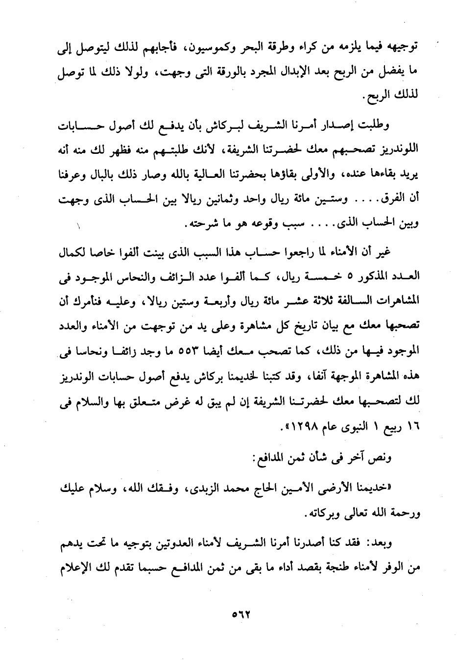 وطلبت إصدار أمرنا الشريف لبركاش بأن يدفع لك أصول حسابات اللوندريز تصحبهم معك لحضرتنا الشريفة، لأنك طلبتهم منه فظهر لك منه أنه يريد بقاءها عنده، والأولى بقاؤها بحضرتنا العالية بالله وصار ذلك بالبال وعرفنا أن الفرق ... وستين مائة ريال واحد وثمانين ريالا بين الحساب الذى وجهت وبين الحساب الذى ... سبب وقوعه هو ما شرحته.