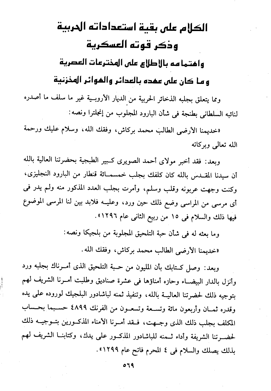 "خديمنا الأرضى الطالب محمد بركاش، وفقك الله، وسلام عليك ورحمة الله تعالى وبركاته وبعد: فقد أخبر مولاى أحمد الصويرى كبير الطبجية بحضرتنا العالية بالله أن سيدنا المقدس بالله كان كلفك بجلب خمسمائة قنطار من البارود النجليزى، وكنت وجهت عربونه وقلب وسلم، وأمرت بجلب العدد المذكور منه ولم يدر في أى مرسى من المراسى وضع ذلك حين ورد، وعليه فلابد بين لنا المرسى الموضوع فيها ذلك والسلام في 15 من ربيع الثانى عام 1296".