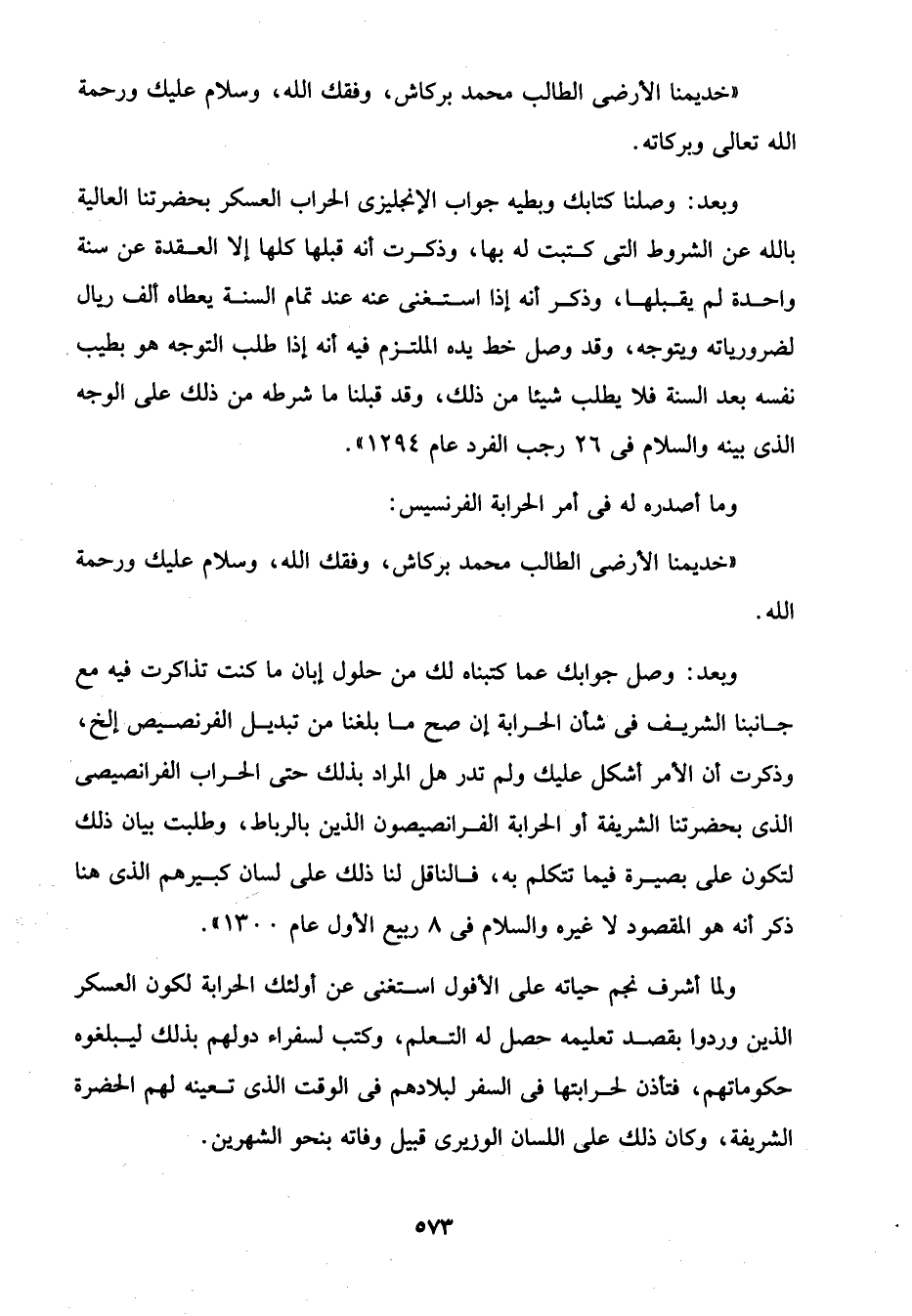 وبعد: وصل جوابك عما كتبناه لك من حلول إبان ما كنت تذاكرت فيه مع جانبنا الشريف في شأن الحرابة إن صح ما بلغنا من تبديل الفرنصيص إلخ، وذكرت أن الأمر أشكل عليك ولم تدر هل المراد بذلك حتى الحراب الفرانصيصى الذى بحضرتنا الشريفة أو الحرابة الفرانصيصون الذين بالرباط، وطلبت بيان ذلك لتكون على بصيرة فيما تتكلم به، فالناقل لنا ذلك على لسان كبيرهم الذى هنا ذكر أنه هو المقصود لا غيره والسلام في 8 ربيع الأول عام 1300".
