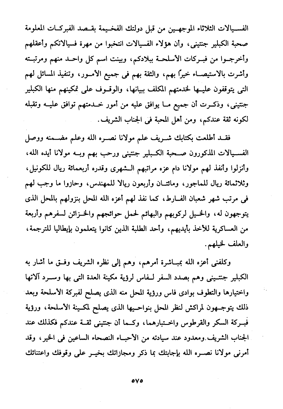 وكلفنى أعزه الله بمباشرة أمرهم، وهم إلى نظره الشريف وفق ما أشار به الكبير جنتينى وهم بصدد السفر لفاس لرؤية مكينة العدة التي بها وسرد آلاتها واختيارها والتطوف بوادى فاس ورؤية المحل منه الذى يصلح لفبركة الأسلحة وبعد ذلك يتوجهون لمراكش لنظر المحل بنواحيها الذى يصلح لمكينة الأسلحة، ورؤية فبركة السكر والقرطوس واختبارهما، وكما أن جنتينى ثقة عندكم فكذلك عند الجناب الشريف ومعدود عند سيادته من الأحباء النصحاء الساعين في الخير، وقد أمرنى مولانا نصره الله بإجابتك بما ذكر ومجازاتك بخير على وقوفك واعتنائك