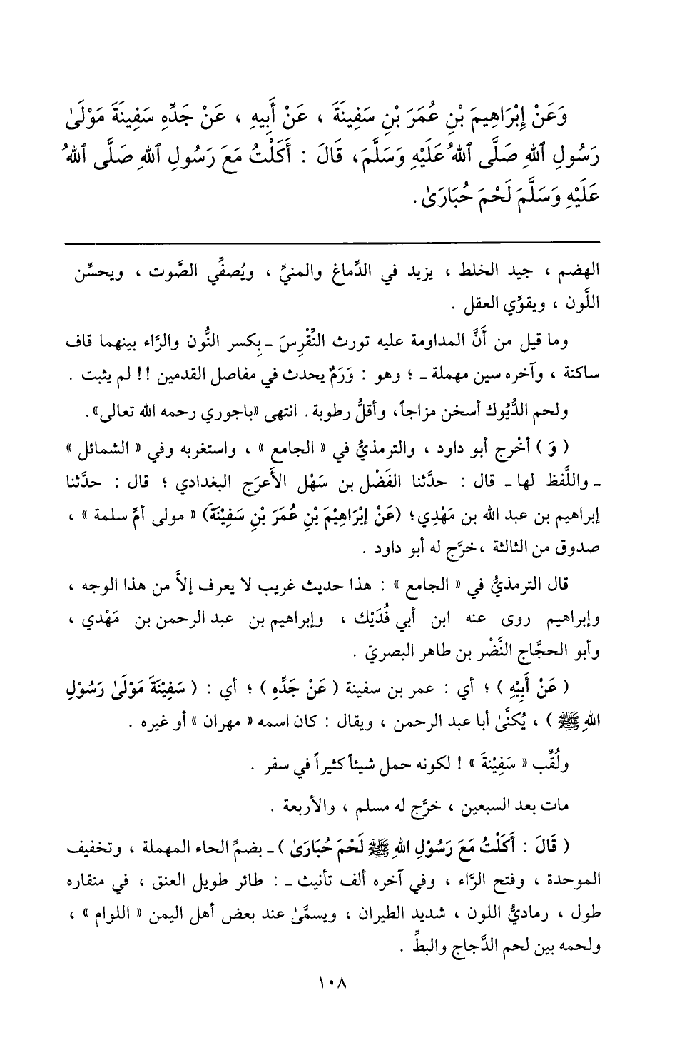 وعن إبراهيم بن عمر بن سفينة، عن أبيه، عن جدّه سفينة مولى رسول الله صلّى الله عليه وسلّم، قال: أكلت مع رسول الله صلّى الله عليه وسلّم لحم حبارى.