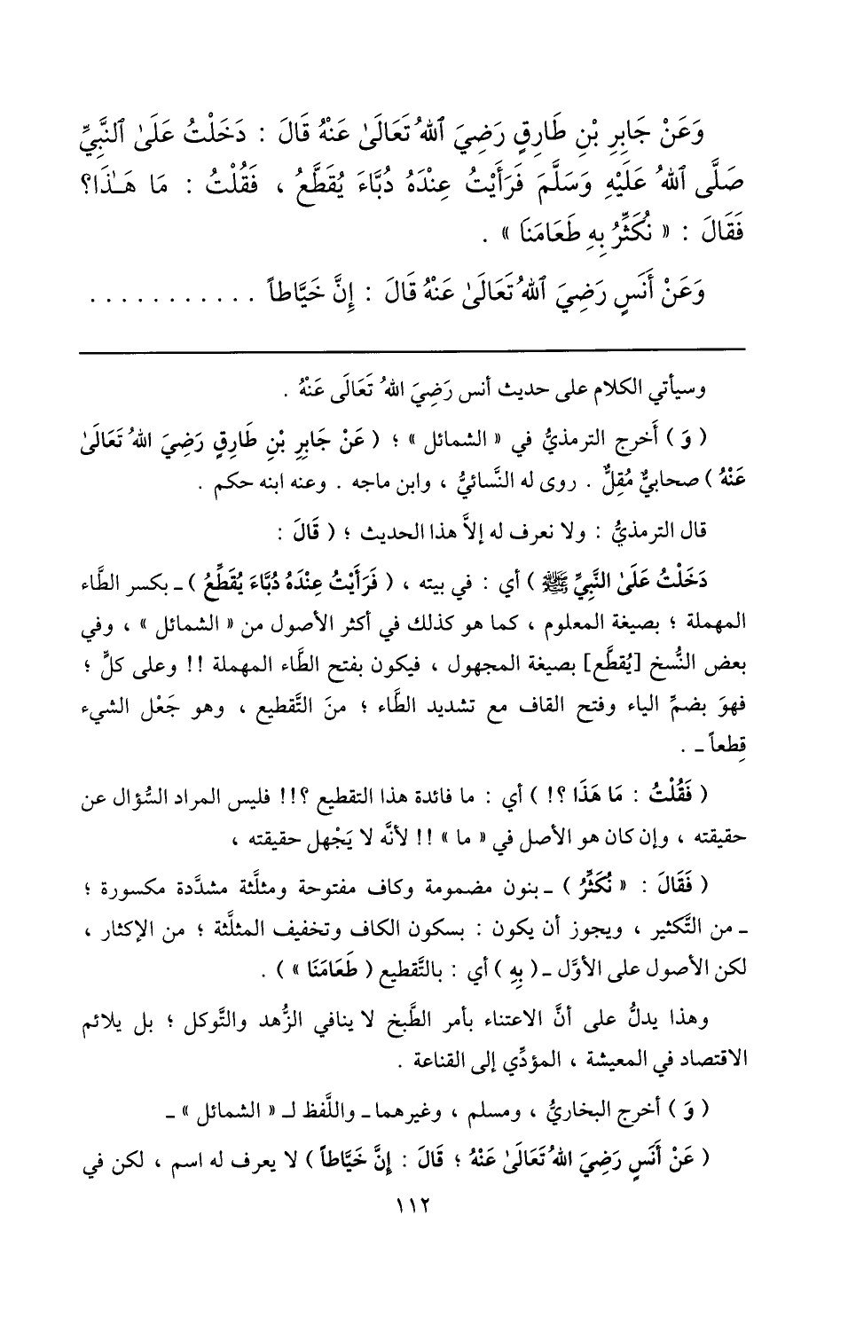 وعن جابر بن طارق رضي الله تعالى عنه قال: دخلت على النّبيّ صلّى الله عليه وسلّم فرأيت عنده دبّاء يقطّع، فقلت: ما هذا؟