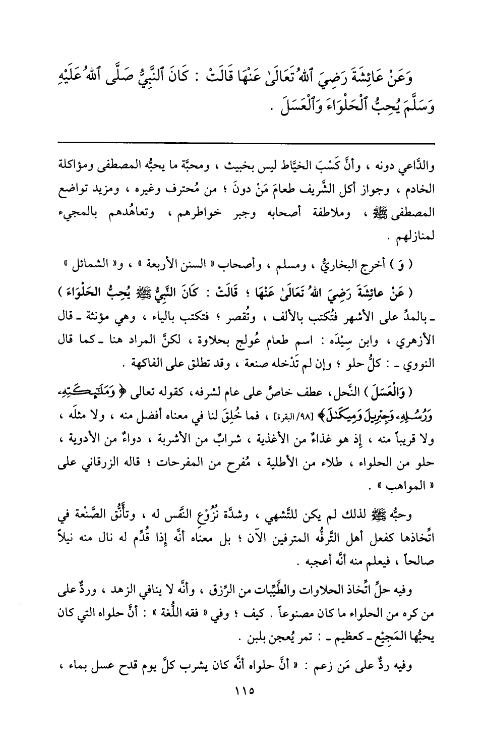 وعن عائشة رضي الله تعالى عنها قالت: كان النّبيّ صلّى الله عليه وسلّم يحبّ الحلواء والعسل.