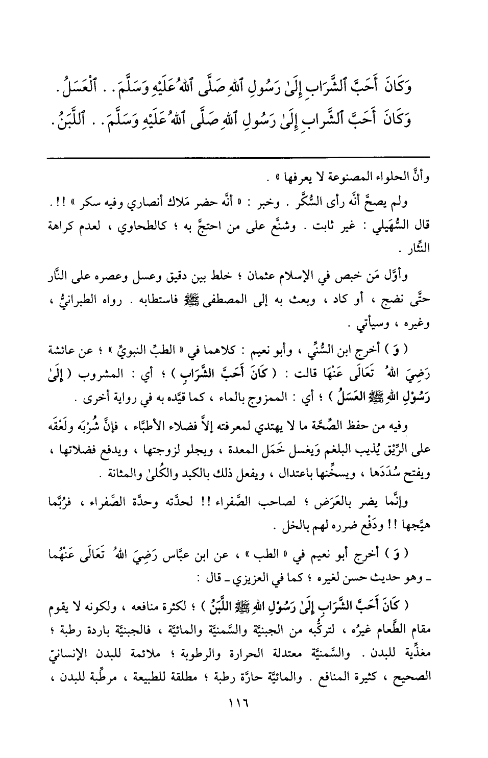 (و) أخرج ابن السّنّي، وأبو نعيم: كلاهما في «الطبّ النبويّ» ؛ عن عائشة رضي الله تعالى عنها قالت: (كان أحبّ الشّراب) ؛ أي: المشروب (إلى رسول الله صلّى الله عليه وسلم العسل) ؛ أي: الممزوج بالماء، كما قيّده به في رواية أخرى.