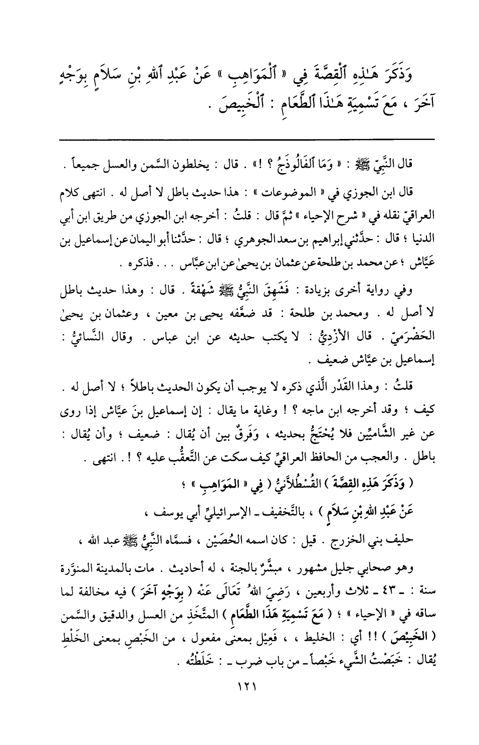 وهو صحابي جليل مشهور، مبشّر بالجنة، له أحاديث. مات بالمدينة المنوّرة سنة: - 43- ثلاث وأربعين، رضي الله تعالى عنه (بوجه آخر) فيه مخالفة لما ساقه في «الإحياء» ؛ (مع تسمية هذا الطّعام) المتّخذ من العسل والدقيق والسّمن (الخبيص) !! أي: الخليط، فعيل بمعنى مفعول، من الخبص بمعنى الخلط يقال: خبصت الشّيء خبصا- من باب ضرب-: خلطته.
