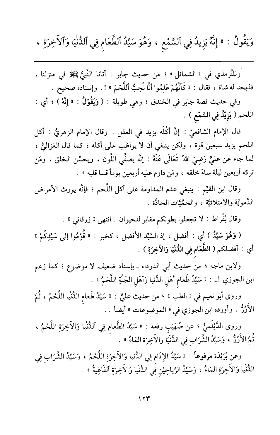 ولابن ماجه؛ من حديث أبي الدرداء- بإسناد ضعيف لا موضوع؛ كما زعم ابن الجوزي! -: «سيّد طعام أهل الدّنيا وأهل الجنّة اللّحم» .