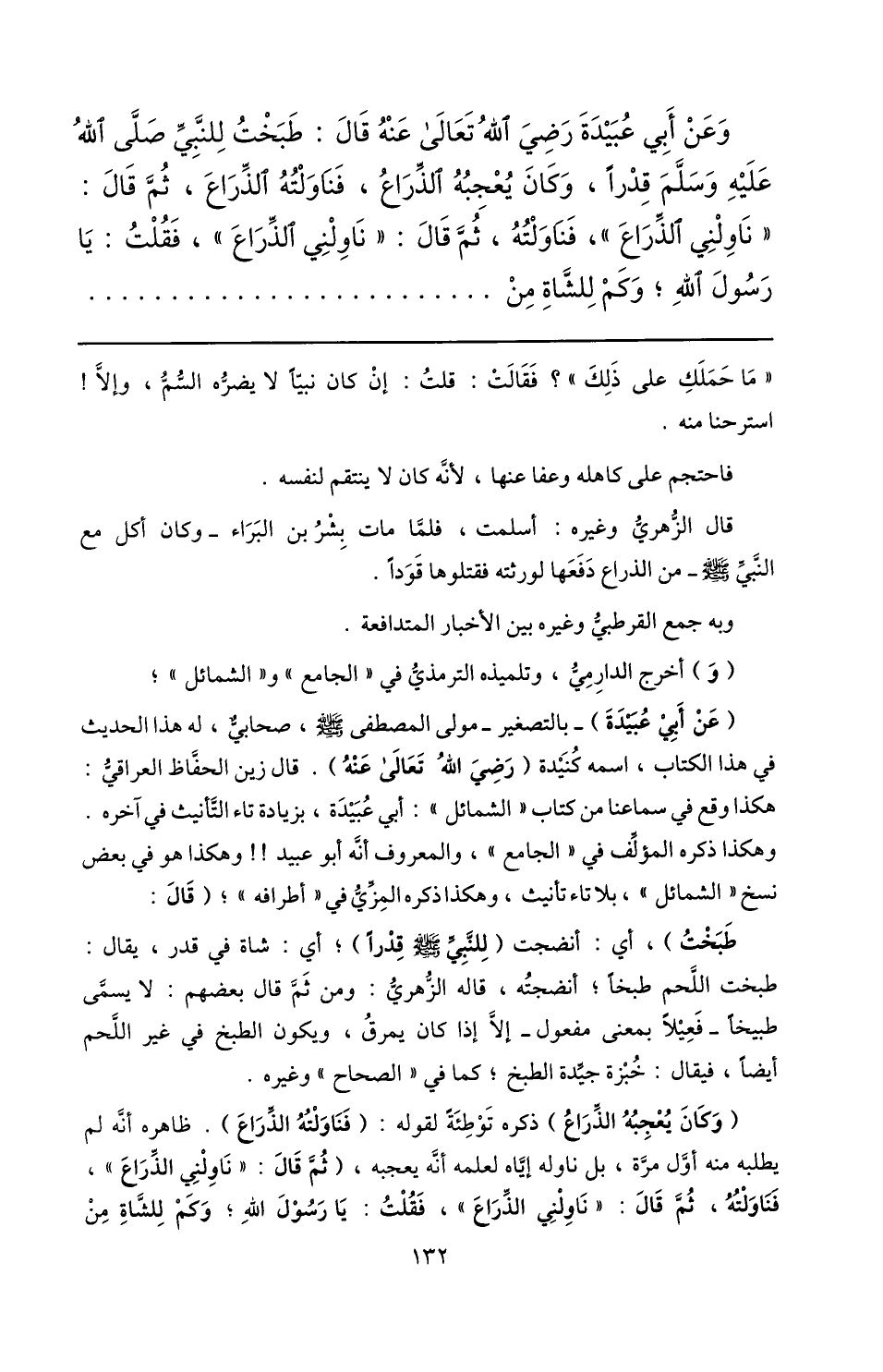 وعن أبي عبيدة رضي الله تعالى عنه قال: طبخت للنّبيّ صلّى الله عليه وسلّم قدرا، وكان يعجبه الذّراع، فناولته الذّراع، ثمّ قال: