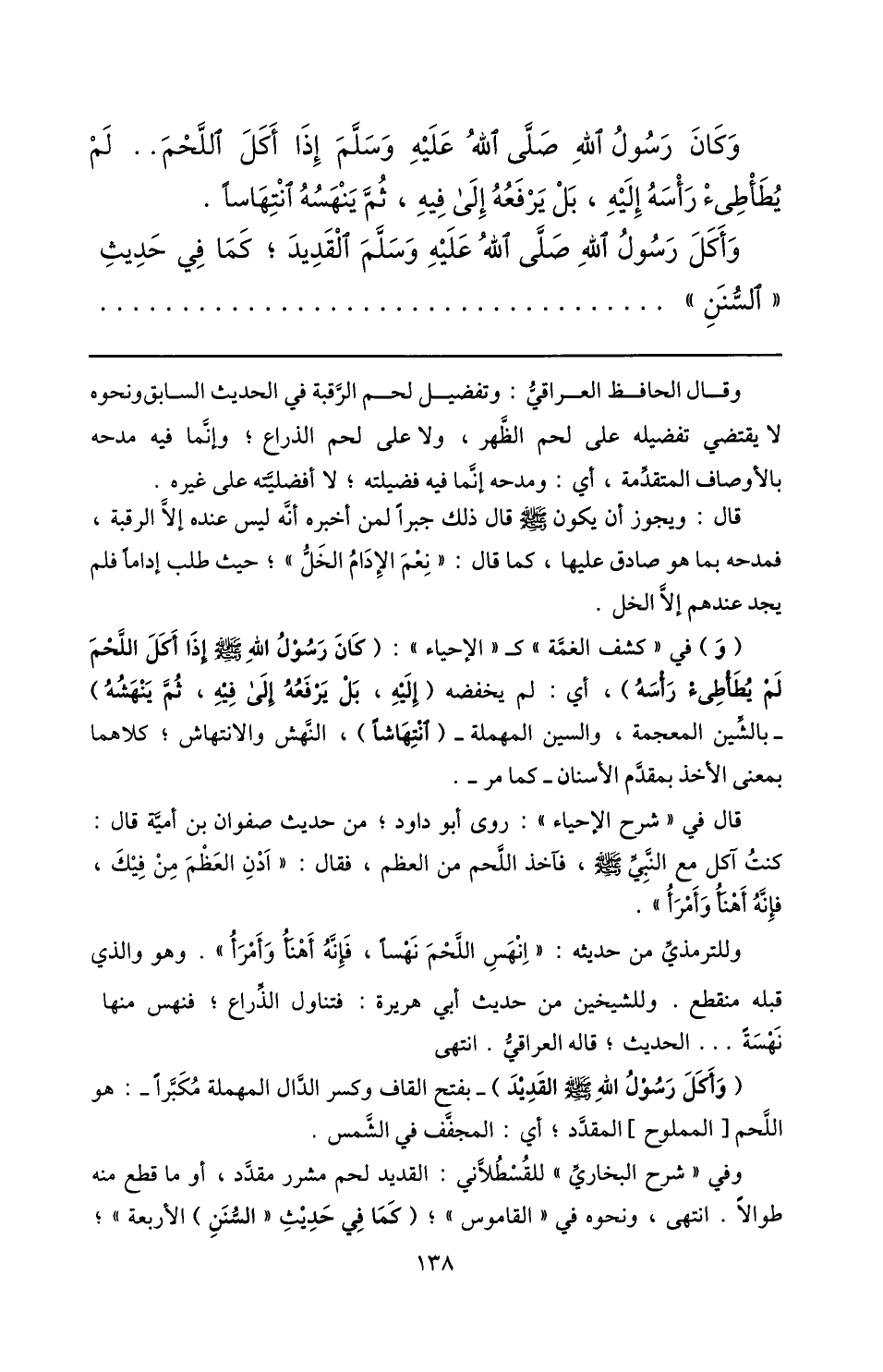 وقال الحافظ العراقيّ: وتفضيل لحم الرّقبة في الحديث السابق ونحوه لا يقتضي تفضيله على لحم الظّهر، ولا على لحم الذراع؛ وإنّما فيه مدحه بالأوصاف المتقدّمة، أي: ومدحه إنّما فيه فضيلته؛ لا أفضليّته على غيره.