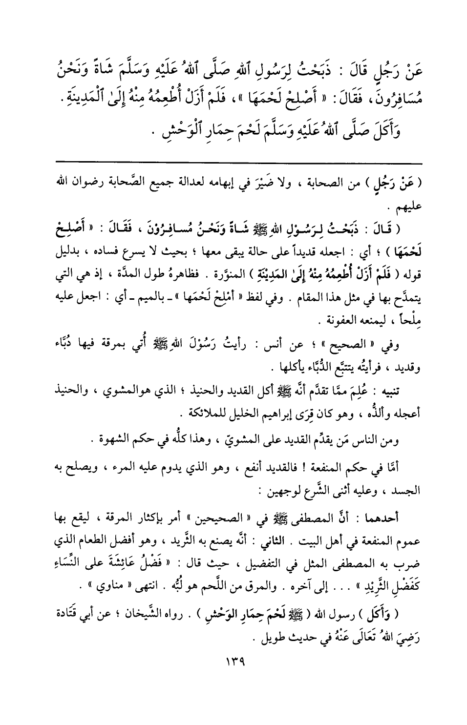 (قال: ذبحت لرسول الله صلّى الله عليه وسلم شاة ونحن مسافرون، فقال: «أصلح لحمها) ؛ أي: اجعله قديدا على حالة يبقى معها؛ بحيث لا يسرع فساده، بدليل قوله (فلم أزل أطعمه منه إلى المدينة) المنوّرة. فظاهره طول المدّة، إذ هي التي يتمدّح بها في مثل هذا المقام. وفي لفظ «أملح لحمها» - بالميم- أي: اجعل عليه ملحا، ليمنعه العفونة.