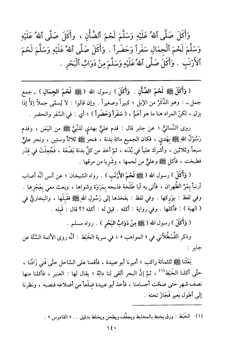 (وأكل صلّى الله عليه وسلم لحم الضّأن. وأكل) رسول الله (صلى الله عليه وسلم لحم الجمال) - جمع جمل-: وهو الذّكر من الإبل؛ كبيرا وصغيرا. وإن قالوا: لا يسمّى جملا إلّا إذا بزل، لكنّ المراد هنا ما هو أعمّ، (سفرا وحضرا) ؛ أي: في السّفر والحضر.
