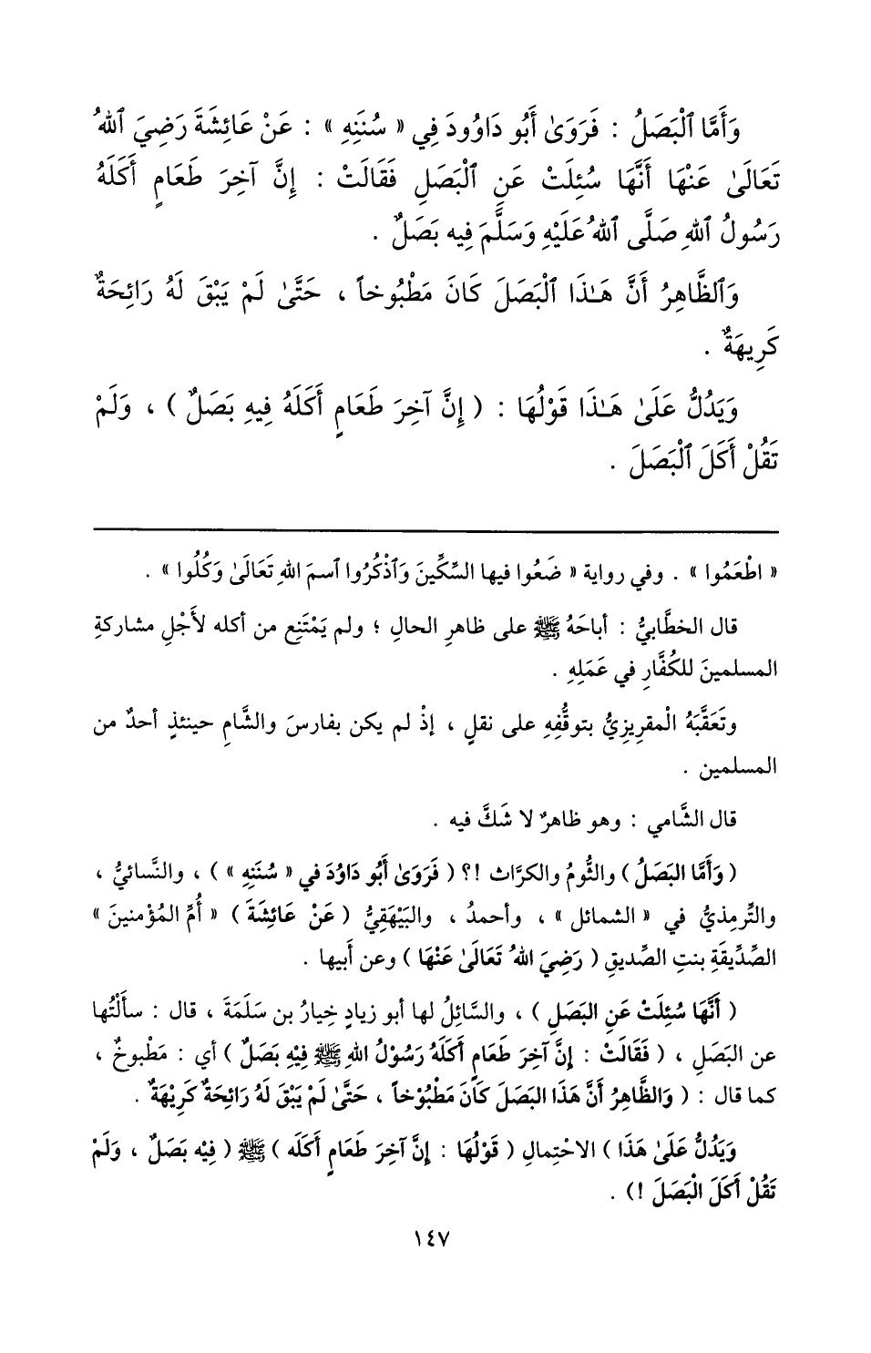 وأمّا البصل: فروى أبو داود في «سننه» : عن عائشة رضي الله تعالى عنها أنّها سئلت عن البصل فقالت: إنّ آخر طعام أكله رسول الله صلّى الله عليه وسلّم فيه بصل.