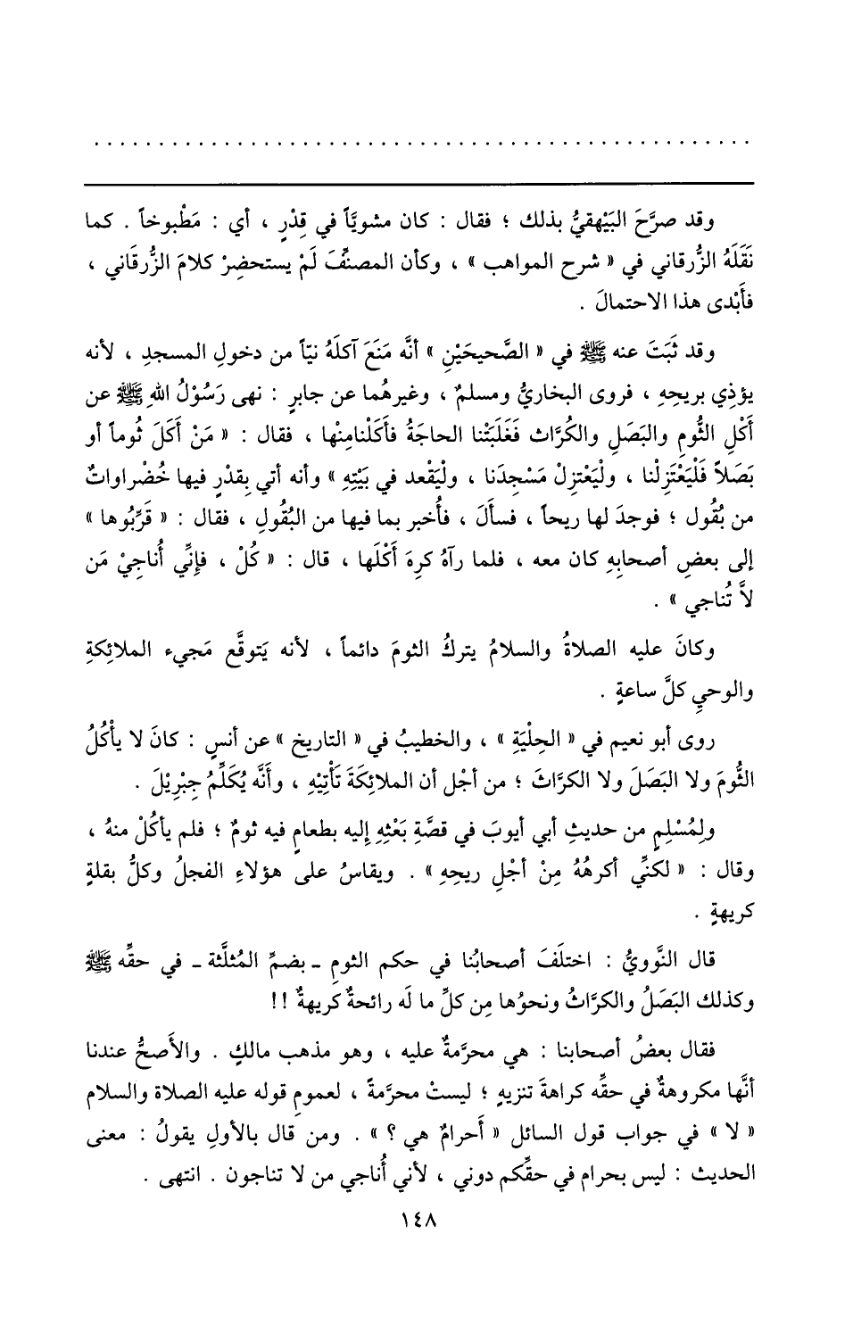 روى أبو نعيم في «الحلية» ، والخطيب في «التاريخ» عن أنس: كان لا يأكل الثّوم ولا البصل ولا الكرّاث؛ من أجل أن الملائكة تأتيه، وأنّه يكلّم جبريل.