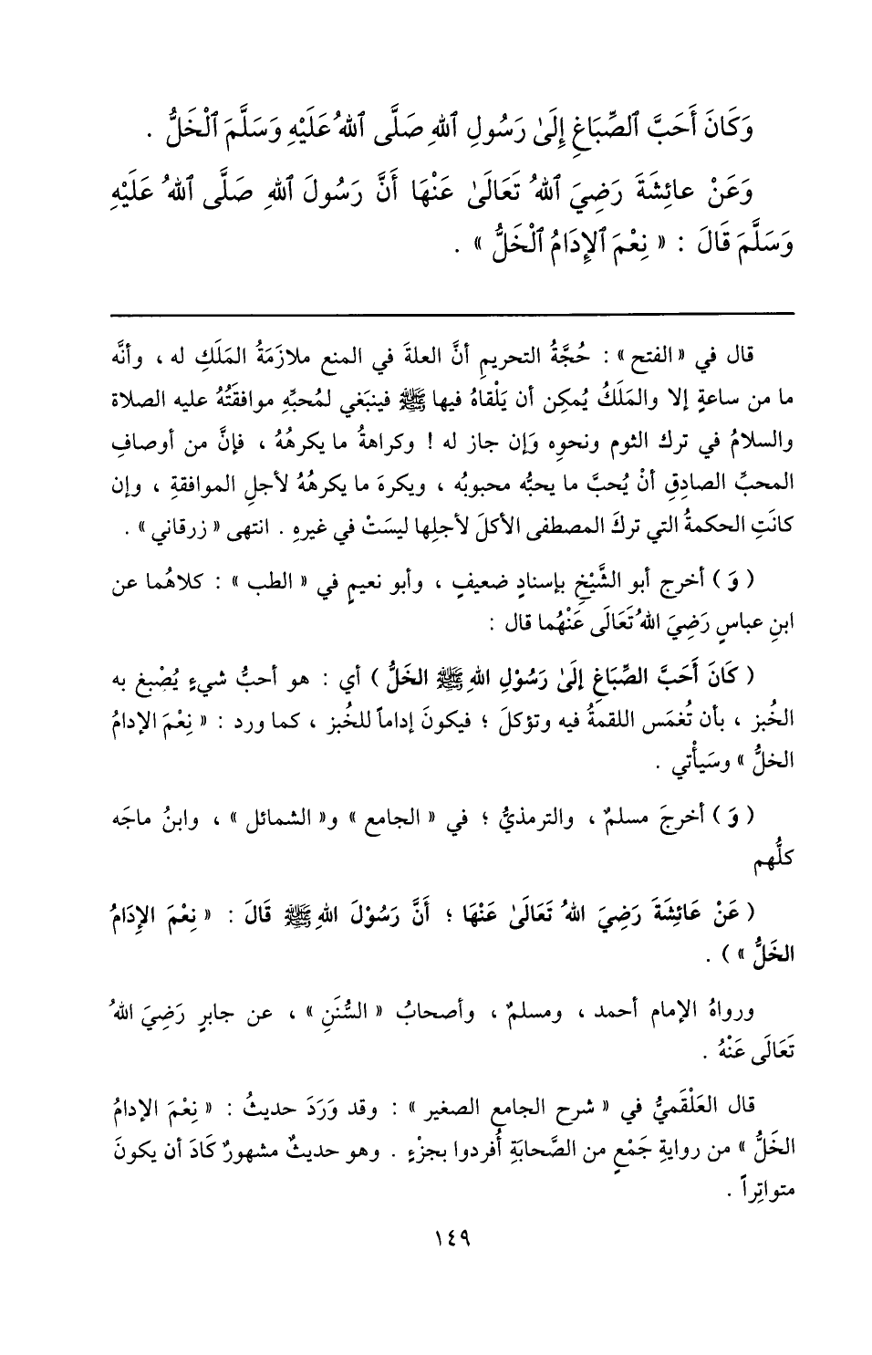 (عن عائشة رضي الله تعالى عنها؛ أنّ رسول الله صلّى الله عليه وسلم قال: «نعم الإدام الخلّ» ) .