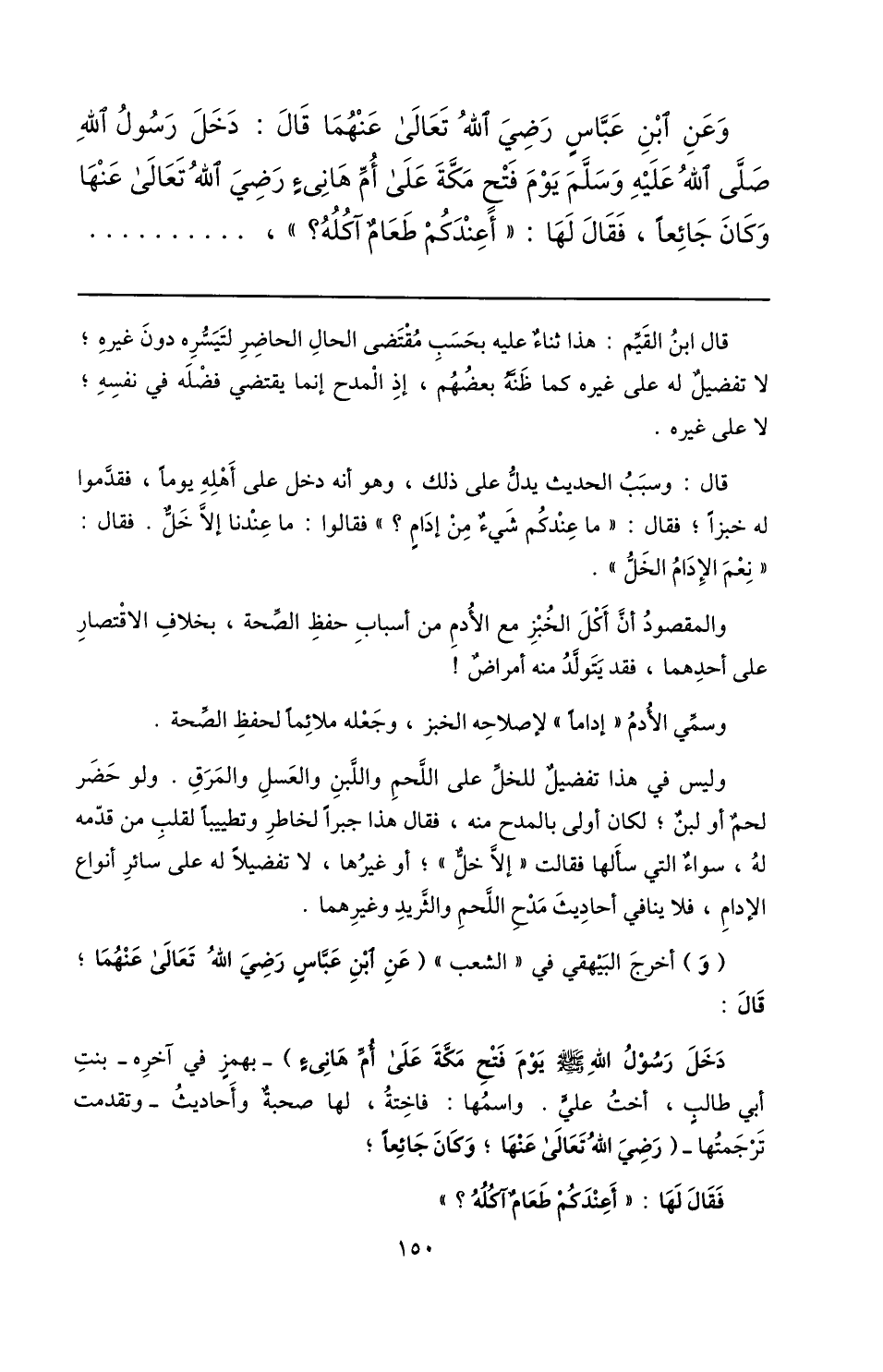 وعن ابن عبّاس رضي الله تعالى عنهما قال: دخل رسول الله صلّى الله عليه وسلّم يوم فتح مكّة على أمّ هانىء رضي الله تعالى عنها وكان جائعا، فقال لها: «أعندكم طعام آكله؟» ، ...