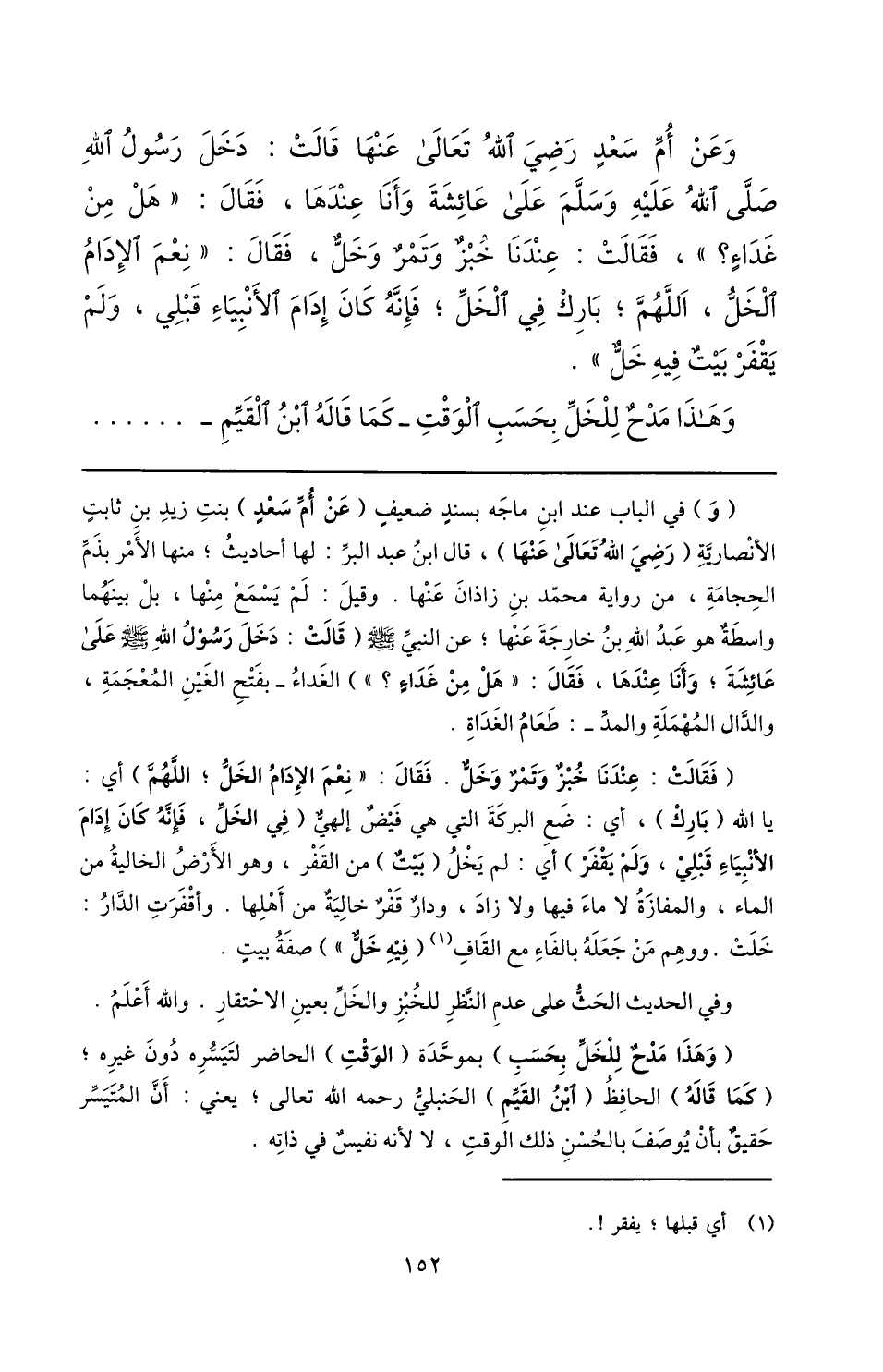 وعن أمّ سعد رضي الله تعالى عنها قالت: دخل رسول الله صلّى الله عليه وسلّم على عائشة وأنا عندها، فقال: «هل من غداء؟» ، فقالت: عندنا خبز وتمر وخلّ، فقال: «نعم الإدام الخلّ، اللهمّ؛ بارك في الخلّ؛ فإنّه كان إدام الأنبياء قبلي، ولم يقفر بيت فيه خلّ» .