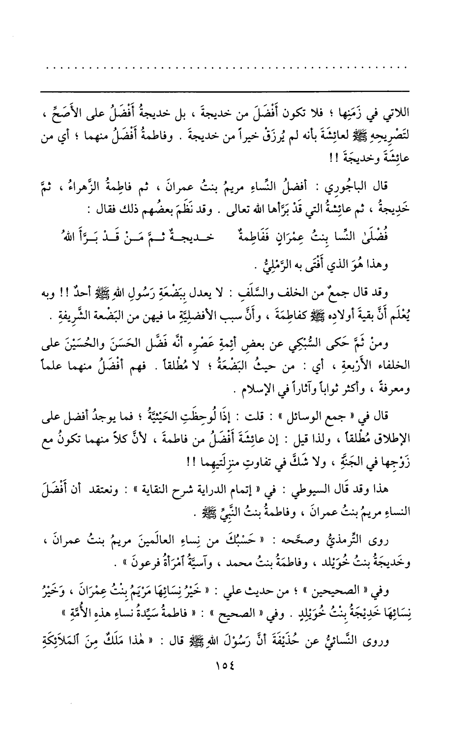 هذا وقد قال السيوطي: في «إتمام الدراية شرح النقاية» : ونعتقد أن أفضل النساء مريم بنت عمران، وفاطمة بنت النّبيّ صلّى الله عليه وسلم.