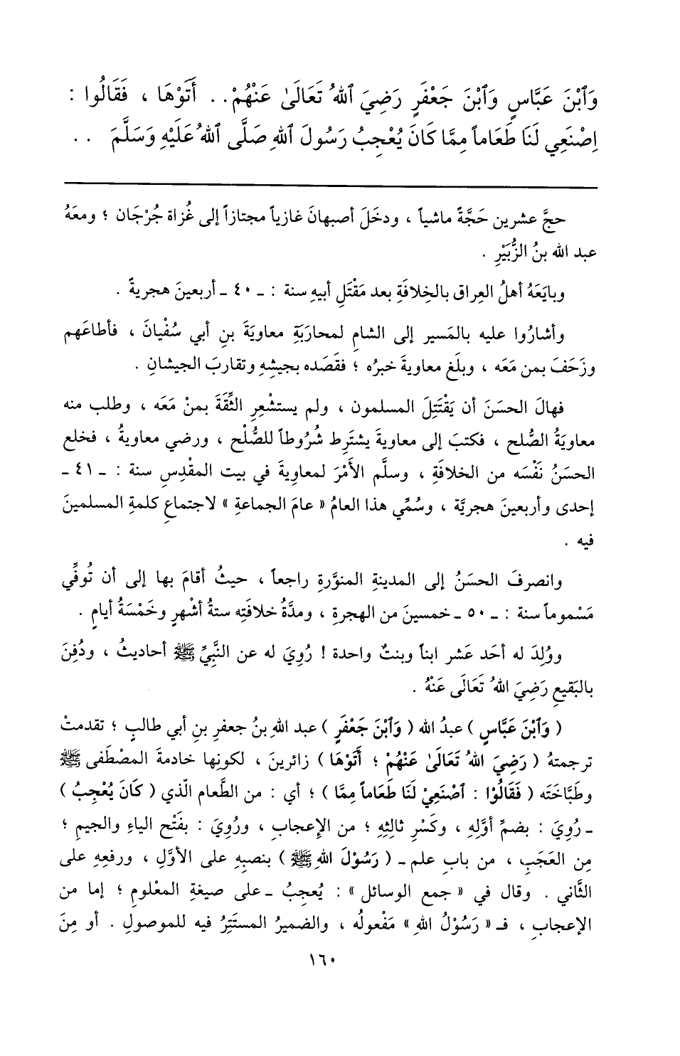 (وابن عبّاس) عبد الله (وابن جعفر) عبد الله بن جعفر بن أبي طالب؛ تقدمت ترجمته (رضي الله تعالى عنهم؛ أتوها) زائرين، لكونها خادمة المصطفى صلّى الله عليه وسلم وطبّاخته (فقالوا: اصنعي لنا طعاما ممّا) ؛ أي: من الطّعام الّذي (كان يعجب) - روي: بضمّ أوّله، وكسر ثالثه؛ من الإعجاب، وروي: بفتح الياء والجيم؛ من العجب، من باب علم- (رسول الله صلّى الله عليه وسلم) بنصبه على الأوّل، ورفعه على الثّاني. وقال في «جمع الوسائل» : يعجب- على صيغة المعلوم؛ إما من الإعجاب، ف «رسول الله» مفعوله، والضمير المستتر فيه للموصول. أو من