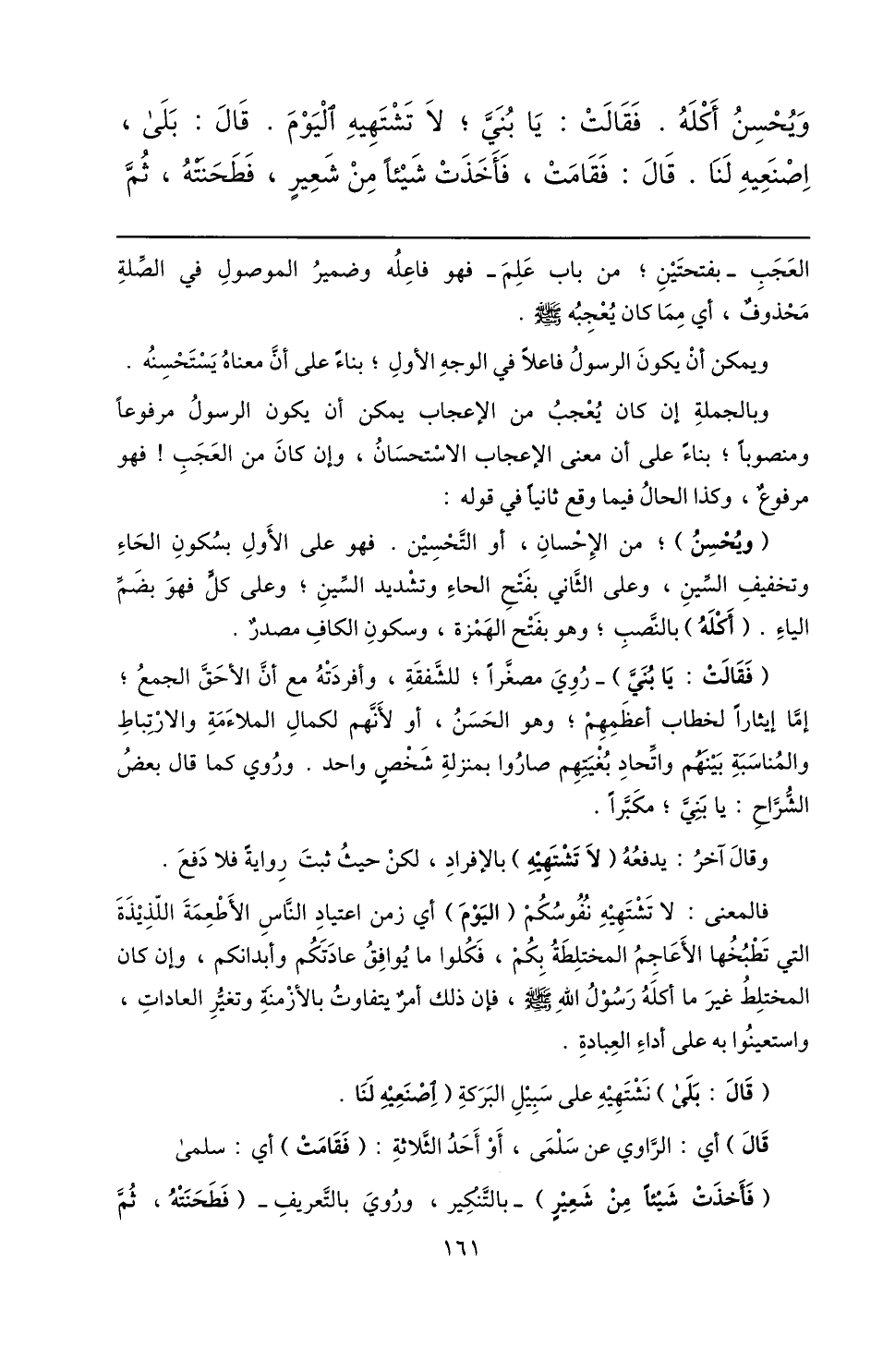 ويحسن أكله. فقالت: يا بنيّ؛ لا تشتهيه اليوم. قال: بلى، اصنعيه لنا. قال: فقامت، فأخذت شيئا من شعير، فطحنته، ثمّ