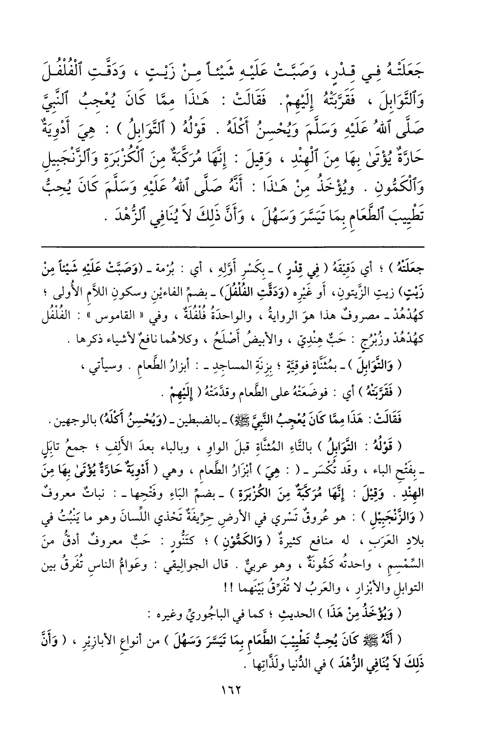 جعلته في قدر، وصبّت عليه شيئا من زيت، ودقّت الفلفل والتّوابل، فقرّبته إليهم. فقالت: هذا ممّا كان يعجب النّبيّ صلّى الله عليه وسلّم ويحسن أكله. قوله (التّوابل) : هي أدوية حارّة يؤتى بها من الهند، وقيل: إنّها مركّبة من الكزبرة والزّنجبيل والكمّون. ويؤخذ من هذا: أنّه صلّى الله عليه وسلّم كان يحبّ تطييب الطّعام بما تيسّر وسهل، وأنّ ذلك لا ينافي الزّهد.