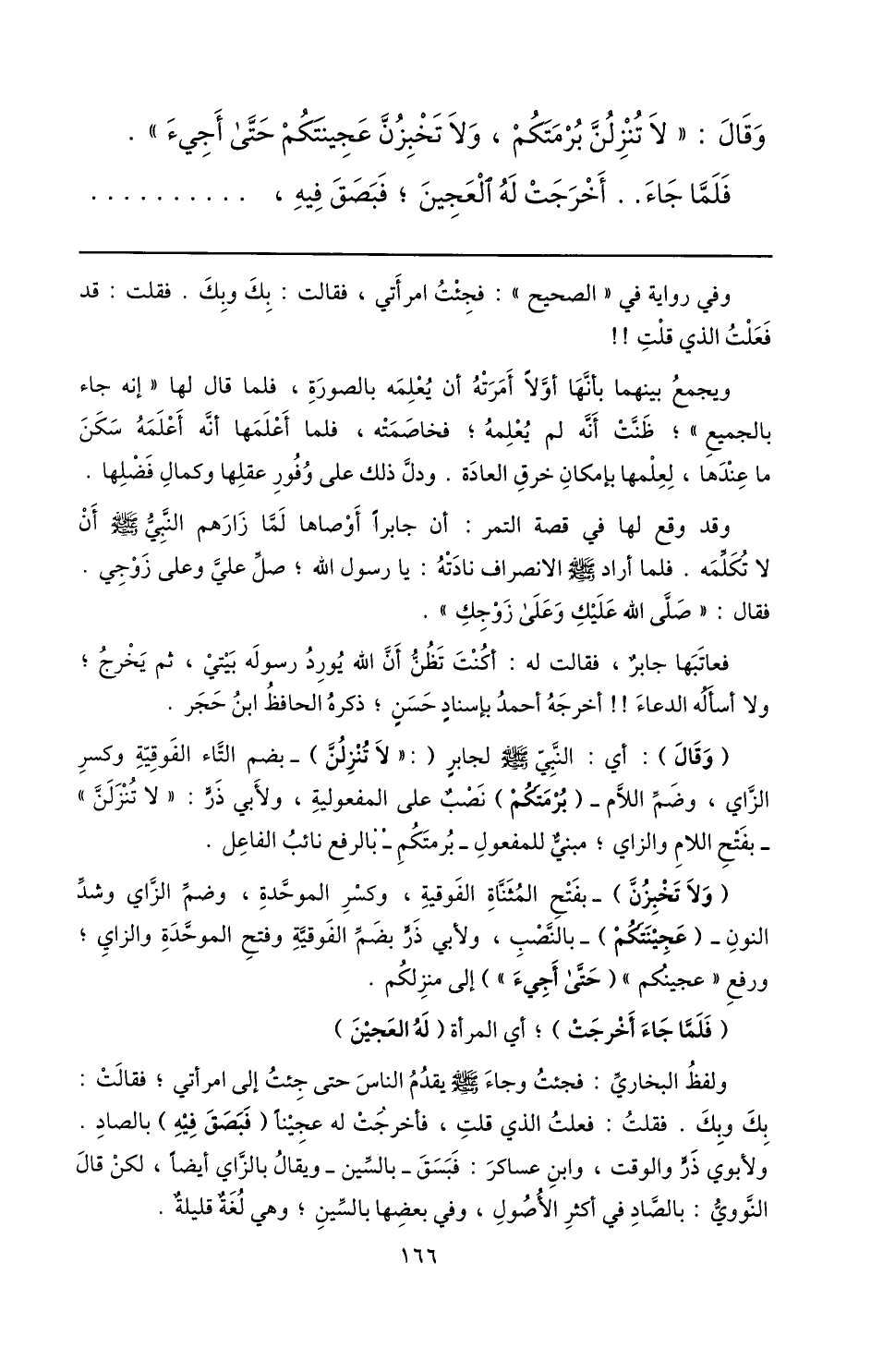 (ولا تخبزنّ) - بفتح المثنّاة الفوقية، وكسر الموحّدة، وضمّ الزّاي وشدّ النون- (عجينتكم) - بالنّصب، ولأبي ذرّ بضمّ الفوقيّة وفتح الموحّدة والزاي؛ ورفع «عجينكم» (حتّى أجيء» ) إلى منزلكم.