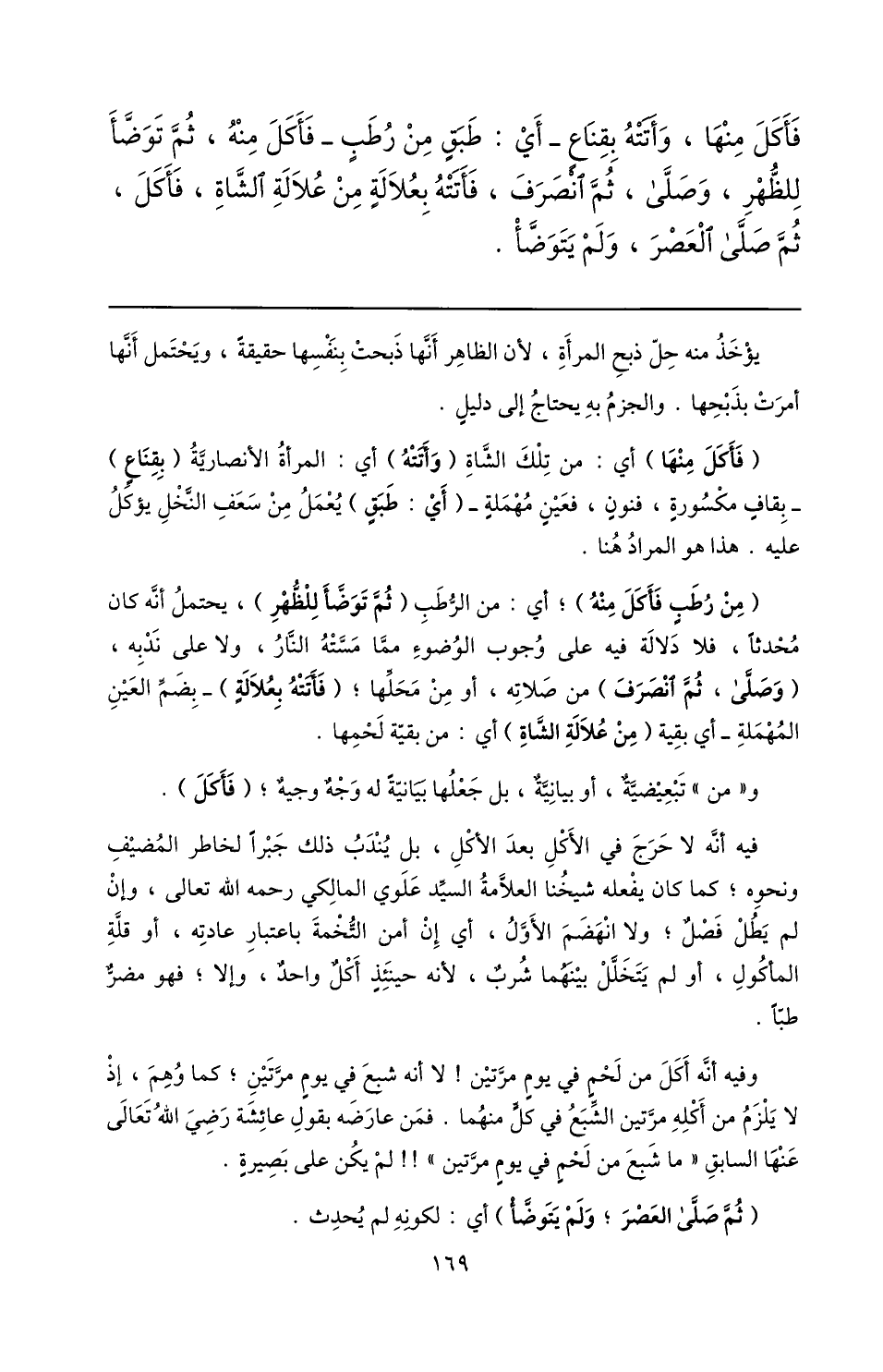 (من رطب فأكل منه) ؛ أي: من الرّطب (ثمّ توضّأ للظّهر) ، يحتمل أنّه كان محدثا، فلا دلالة فيه على وجوب الوضوء ممّا مسّته النّار، ولا على ندبه، (وصلّى، ثمّ انصرف) من صلاته، أو من محلّها؛ (فأتته بعلالة) - بضمّ العين المهملة- أي بقية (من علالة الشّاة) أي: من بقيّة لحمها.