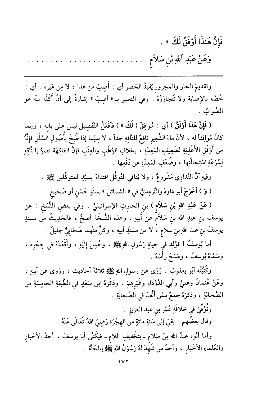 (عن عبد الله بن سلام) بن الحارث الإسرائيليّ. وفي بعض النّسخ: عن يوسف بن عبد الله بن سلام عن أبيه. وهذه النّسخة أصحّ، فالحديث من مسند يوسف بن عبد الله بن سلام، لا من مسند أبيه، وكلّ منهما صحابيّ جليل.