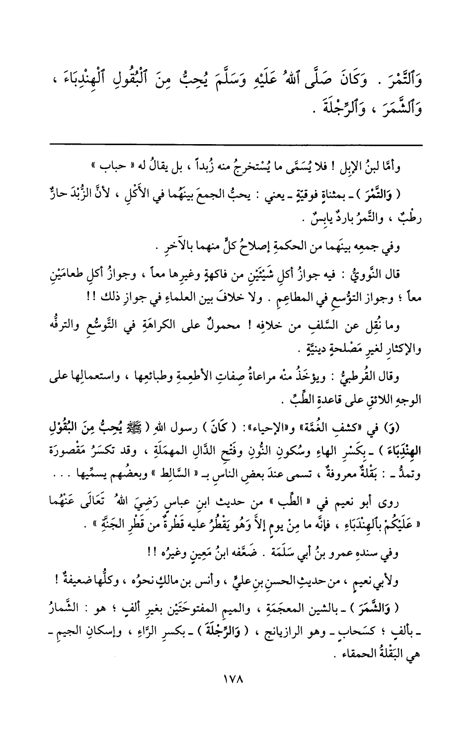 والتّمر. وكان صلّى الله عليه وسلّم يحبّ من البقول الهندباء، والشّمر، والرّجلة.