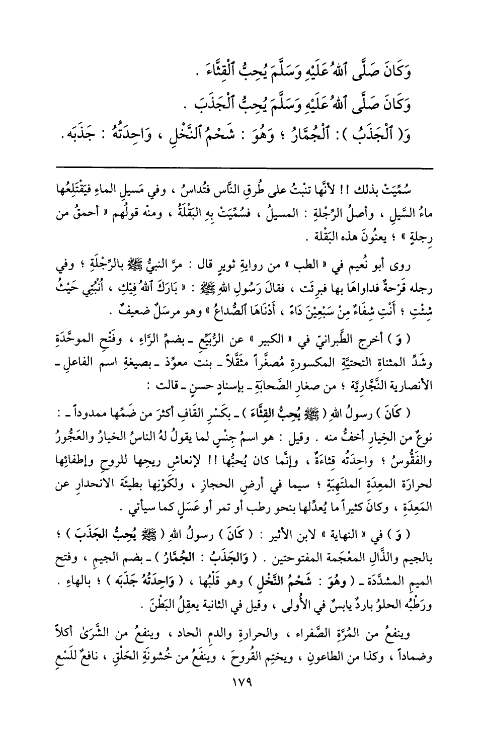 (و) في «النهاية» لابن الأثير: (كان) رسول الله (صلى الله عليه وسلم يحبّ الجذب) ؛ بالجيم والذّال المعجمة المفتوحتين. (والجذب: الجمّار) - بضم الجيم، وفتح الميم المشدّدة- (وهو: شحم النّخل) وهو قلبها، (واحدته جذبه) ؛ بالهاء.