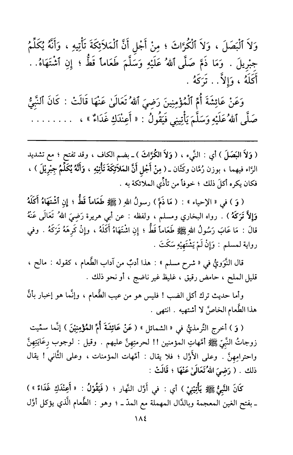 ولا البصل، ولا الكرّاث؛ من أجل أنّ الملائكة تأتيه، وأنّه يكلّم جبريل. وما ذمّ صلّى الله عليه وسلّم طعاما قطّ؛ إن اشتهاه..