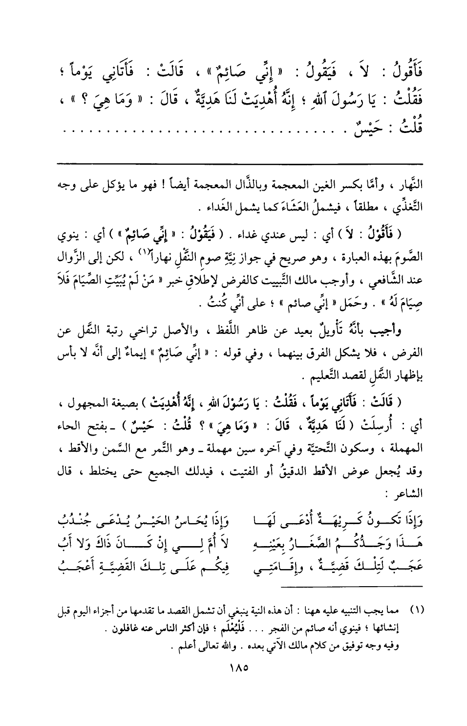 فأقول: لا، فيقول: «إنّي صائم» ، قالت: فأتاني يوما؛ فقلت: يا رسول الله؛ إنّه أهديت لنا هديّة، قال: «وما هي؟» ، قلت: حيس ...