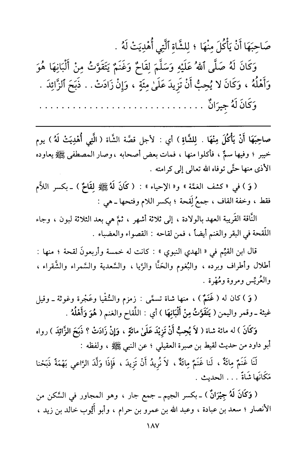 وكان له صلّى الله عليه وسلّم لقاح وغنم يتقوّت من ألبانها هو وأهله، وكان لا يحبّ أن تزيد على مئة، وإن زادت.. ذبح الزّائد.
