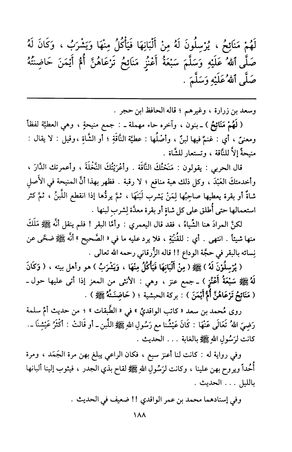 (يرسلون له) صلى الله عليه وسلم (من ألبانها فيأكل منها، ويشرب) هو وأهل بيته، (وكان له صلّى الله عليه وسلم سبعة أعنز) - جمع عنز، وهي: الأنثى من المعز إذا أتى عليها حول- (منائح ترعاهنّ أمّ أيمن) : بركة الحبشية؛ (حاضنته صلّى الله عليه وسلم) .
