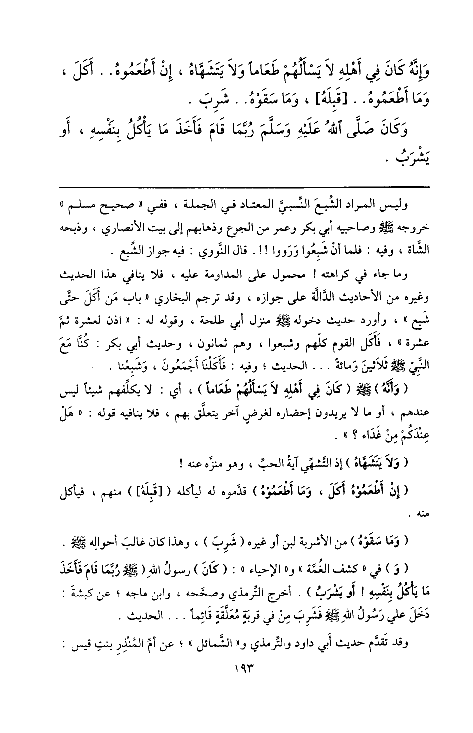 وليس المراد الشّبع النّسبيّ المعتاد في الجملة، ففي «صحيح مسلم» خروجه صلّى الله عليه وسلم وصاحبيه أبي بكر وعمر من الجوع وذهابهم إلى بيت الأنصاري، وذبحه الشّاة، وفيه: فلما أن شبعوا ورووا!!. قال النّووي: فيه جواز الشّبع.