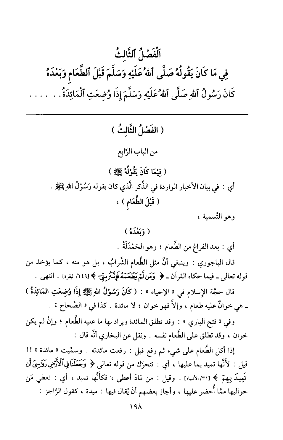 الفصل الثّالث في ما كان يقوله صلّى الله عليه وسلّم قبل الطّعام وبعده كان رسول الله صلّى الله عليه وسلّم إذا وضعت المائدة ...