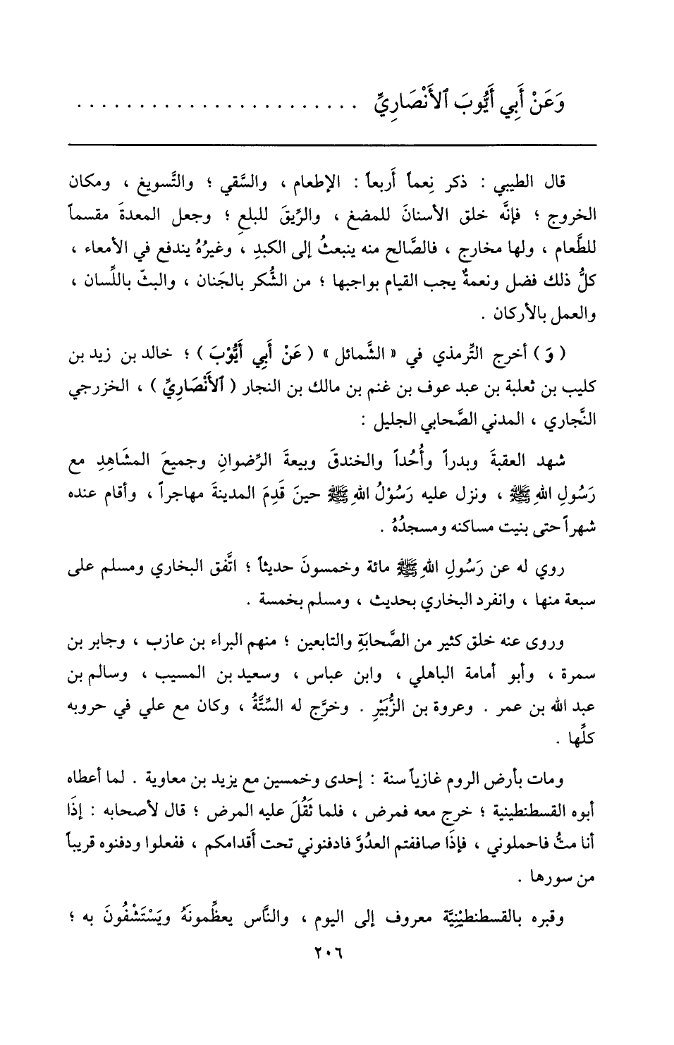 (و) أخرج التّرمذي في «الشّمائل» (عن أبي أيّوب) ؛ خالد بن زيد بن كليب بن ثعلبة بن عبد عوف بن غنم بن مالك بن النجار (الأنصاريّ) ، الخزرجي النّجاري، المدني الصّحابي الجليل: