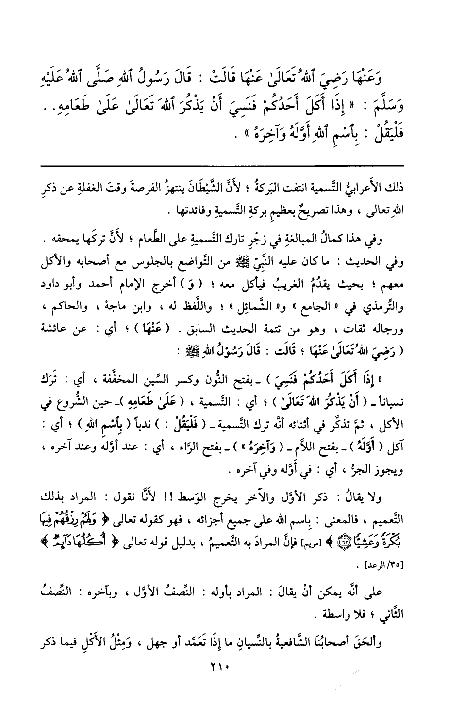 ولا يقال: ذكر الأوّل والآخر يخرج الوسط!! لأنّا نقول: المراد بذلك التّعميم، فالمعنى: باسم الله على جميع أجزائه، فهو كقوله تعالى وَلَهُمْ رِزْقُهُمْ فِيها بُكْرَةً وَعَشِيًّا (62) [مريم] فإنّ المراد به التّعميم، بدليل قوله تعالى أُكُلُها دائِمٌ [35/ الرعد] .