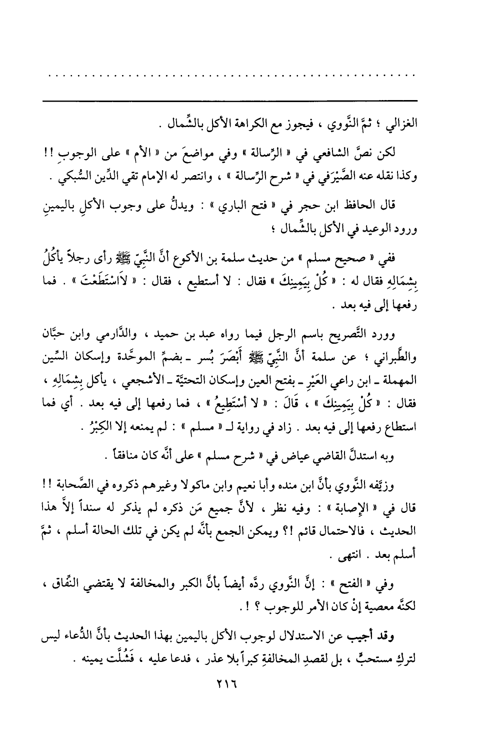 ففي «صحيح مسلم» من حديث سلمة بن الأكوع أنّ النّبيّ صلّى الله عليه وسلم رأى رجلا يأكل بشماله فقال له: «كل بيمينك» فقال: لا أستطيع، فقال: «لا استطعت» . فما رفعها إلى فيه بعد.