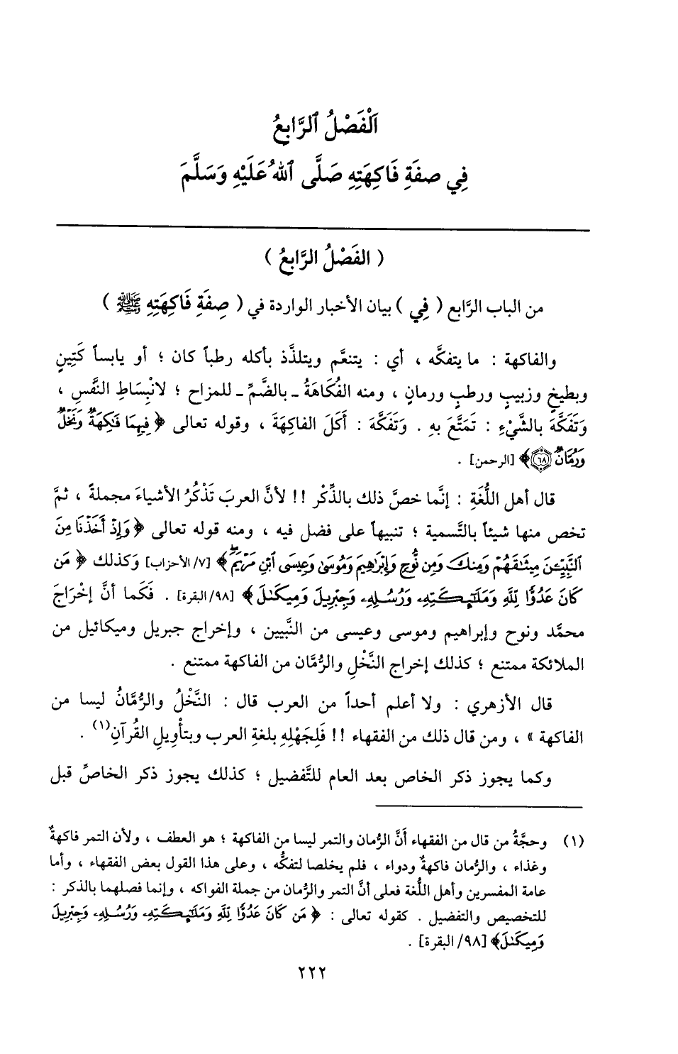 الفصل الرّابع في صفة فاكهته صلّى الله عليه وسلّم (الفصل الرّابع) من الباب الرّابع (في) بيان الأخبار الواردة في (صفة فاكهته صلّى الله عليه وسلم) والفاكهة: ما يتفكّه، أي: يتنعّم ويتلذّذ بأكله رطبا كان؛ أو يابسا كتين وبطيخ وزبيب ورطب ورمان، ومنه الفكاهة- بالضّمّ- للمزاح؛ لانبساط النّفس، وتفكّه بالشّيء: تمتّع به. وتفكّه: أكل الفاكهة، وقوله تعالى فِيهِما فاكِهَةٌ وَنَخْلٌ وَرُمَّانٌ (68) [الرحمن] .