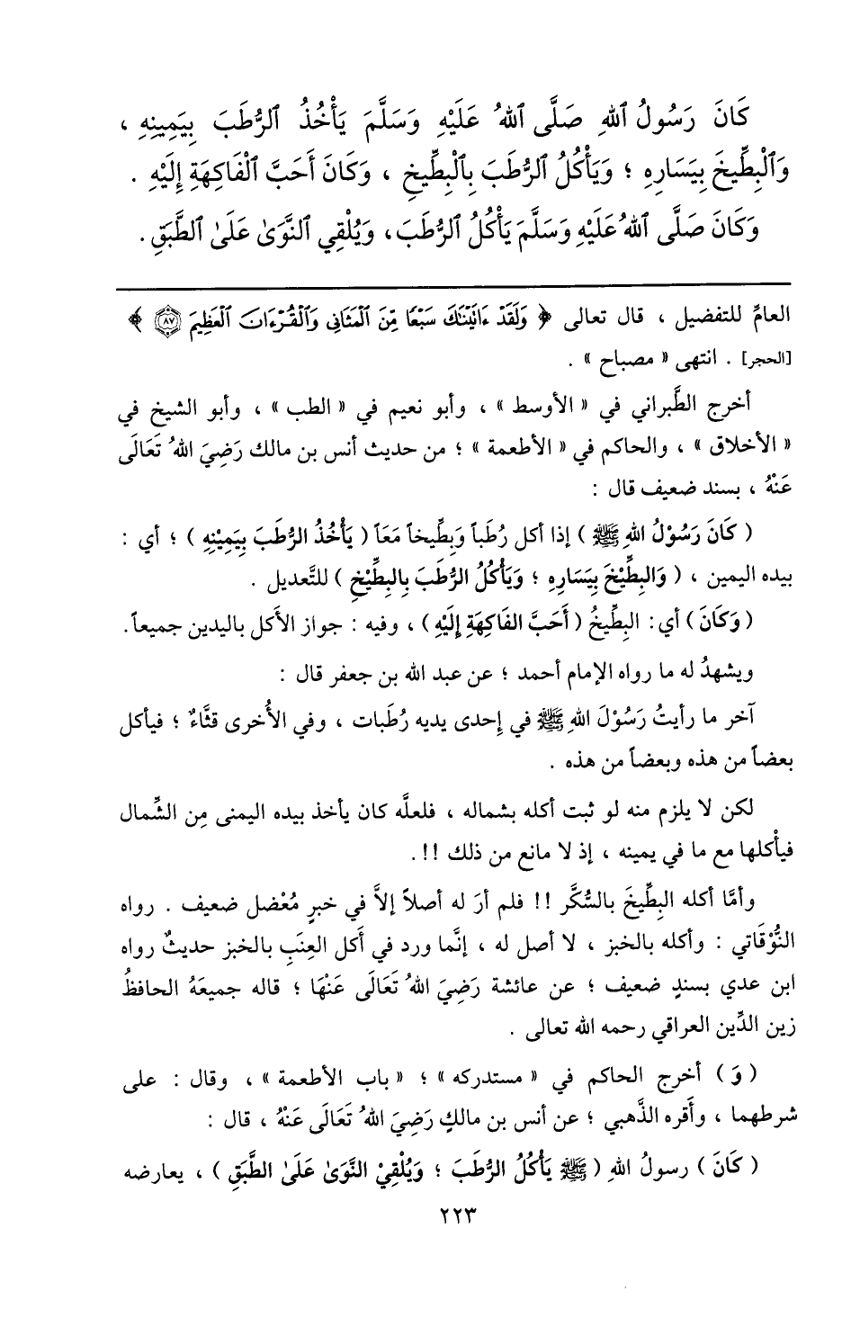 كان رسول الله صلّى الله عليه وسلّم يأخذ الرّطب بيمينه، والبطّيخ بيساره؛ ويأكل الرّطب بالبطّيخ، وكان أحبّ الفاكهة إليه.