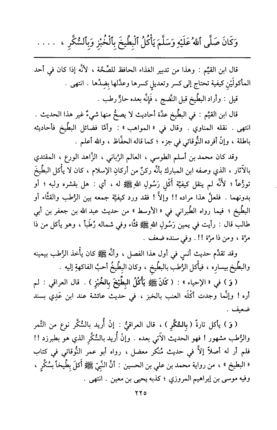 قال ابن القيّم: في البطّيخ عدّة أحاديث لا يصحّ منها شيء غير هذا الحديث.