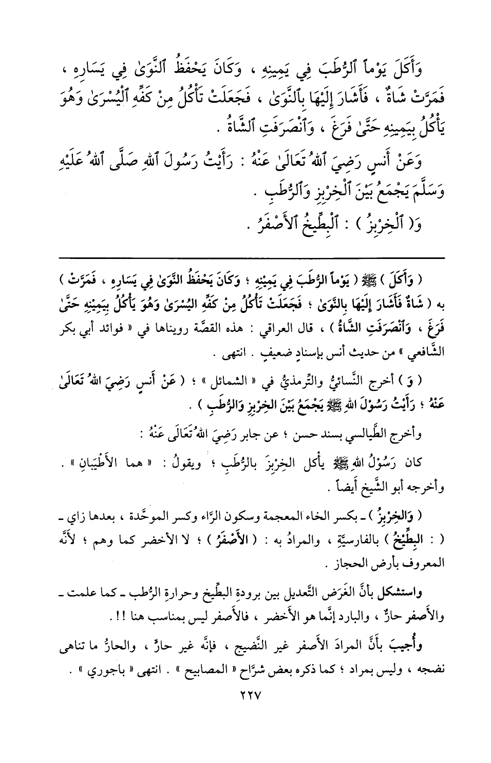 وعن أنس رضي الله تعالى عنه: رأيت رسول الله صلّى الله عليه وسلّم يجمع بين الخربز والرّطب.