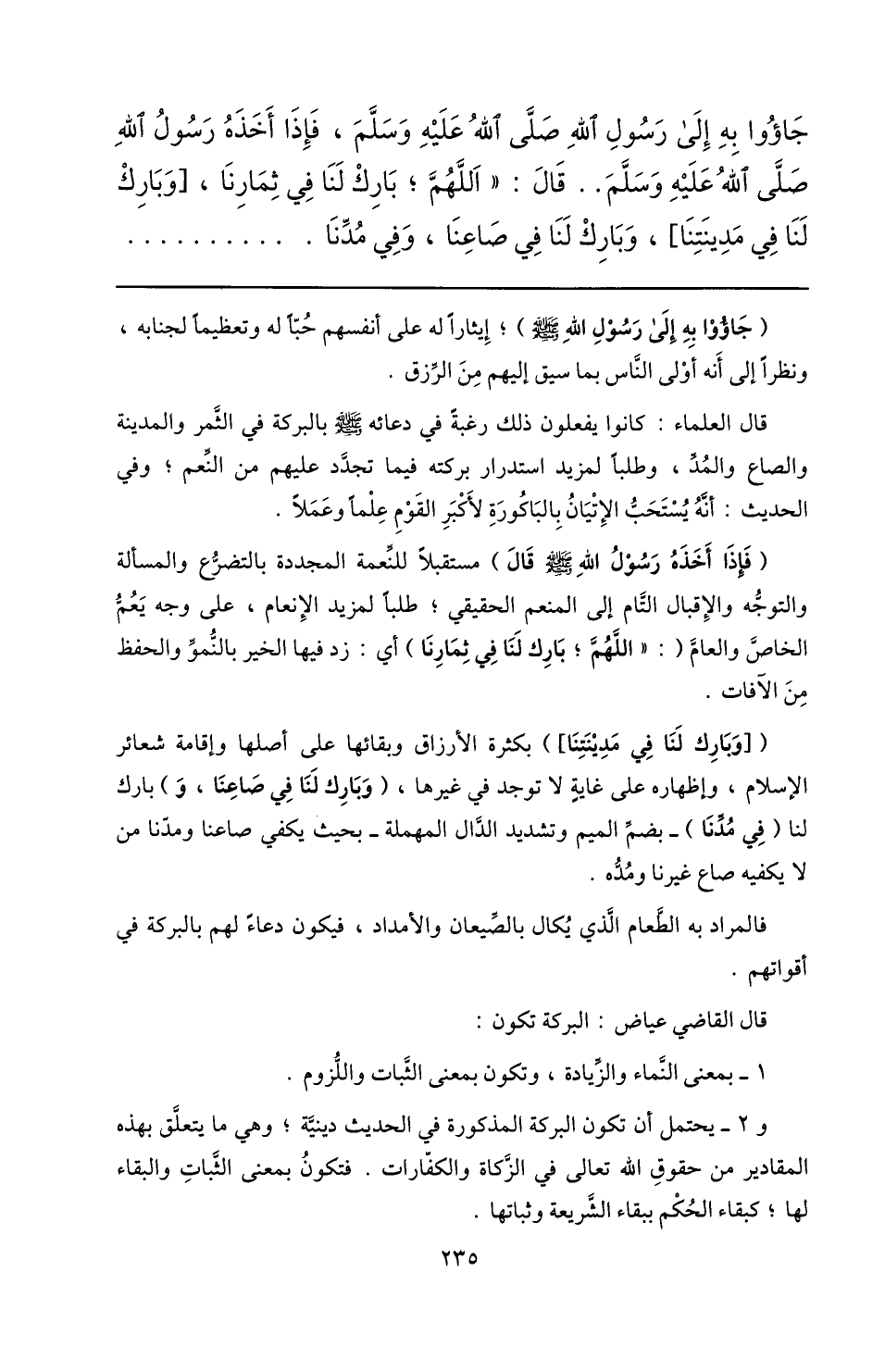 جاؤوا به إلى رسول الله صلّى الله عليه وسلّم، فإذا أخذه رسول الله صلّى الله عليه وسلّم.. قال: «اللهمّ؛ بارك لنا في ثمارنا، [وبارك لنا في مدينتنا] ، وبارك لنا في صاعنا، وفي مدّنا ...
