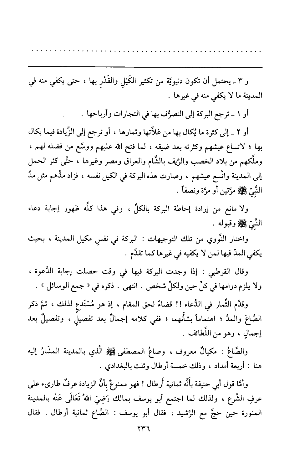 أو 2- إلى كثرة ما يكال بها من غلّاتها وثمارها، أو ترجع إلى الزّيادة فيما يكال بها؛ لاتساع عيشهم وكثرته بعد ضيقه، لما فتح الله عليهم ووسّع من فضله لهم، وملّكهم من بلاد الخصب والرّيف بالشّام والعراق ومصر وغيرها، حتّى كثر الحمل إلى المدينة واتّسع عيشهم، وصارت هذه البركة في الكيل نفسه، فزاد مدّهم مثل مدّ النّبيّ صلّى الله عليه وسلم مرّتين أو مرّة ونصفا.