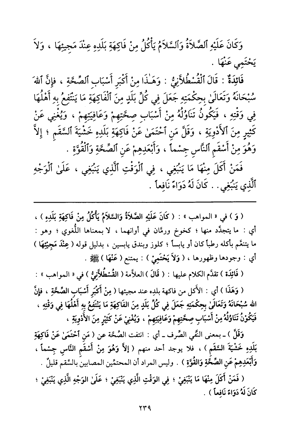 فائدة: قال القسطلّانيّ: وهذا من أكبر أسباب الصّحّة، فإنّ الله سبحانه وتعالى بحكمته جعل في كلّ بلد من الفاكهة ما ينتفع به أهلها في وقته، فيكون تناوله من أسباب صحّتهم وعافيتهم، ويغني عن كثير من الأدوية، وقلّ من احتمى عن فاكهة بلده خشية السّقم؛ إلّا وهو من أسقم النّاس جسما، وأبعدهم عن الصّحّة والقوّة.