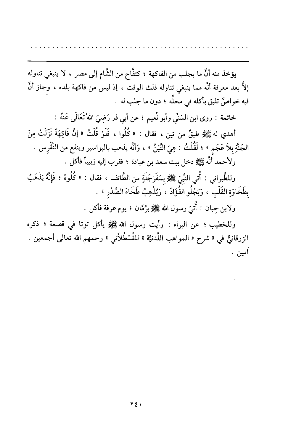 وللخطيب؛ عن البراء: رأيت رسول الله صلّى الله عليه وسلم يأكل توتا في قصعة؛ ذكره الزرقانيّ في «شرح «المواهب اللّدنيّة» للقسطلّاني» رحمهم الله تعالى أجمعين.