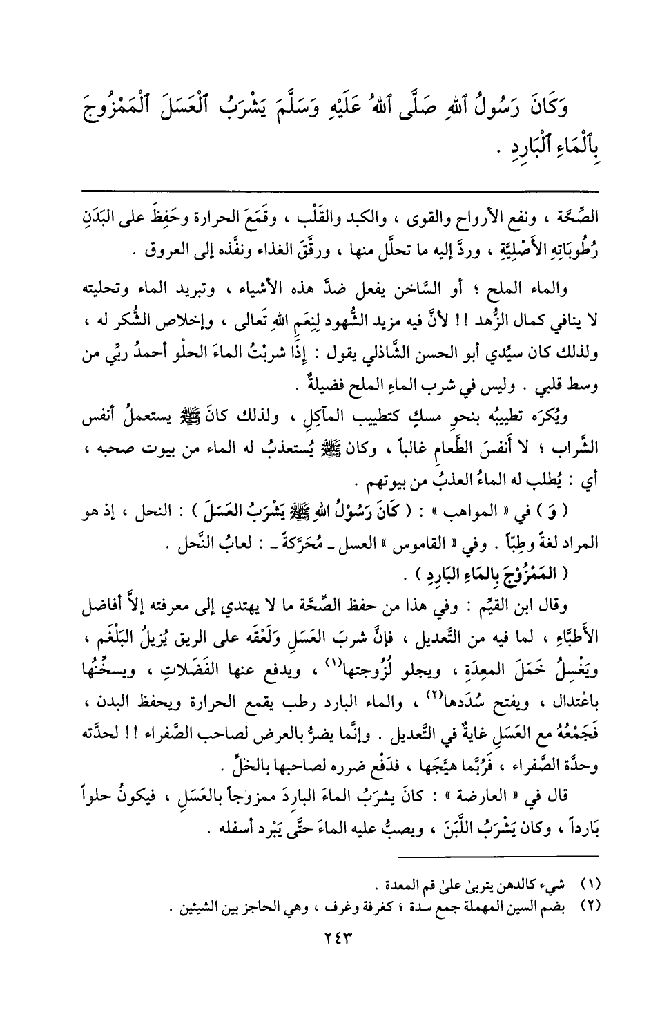 وكان رسول الله صلّى الله عليه وسلّم يشرب العسل الممزوج بالماء البارد.